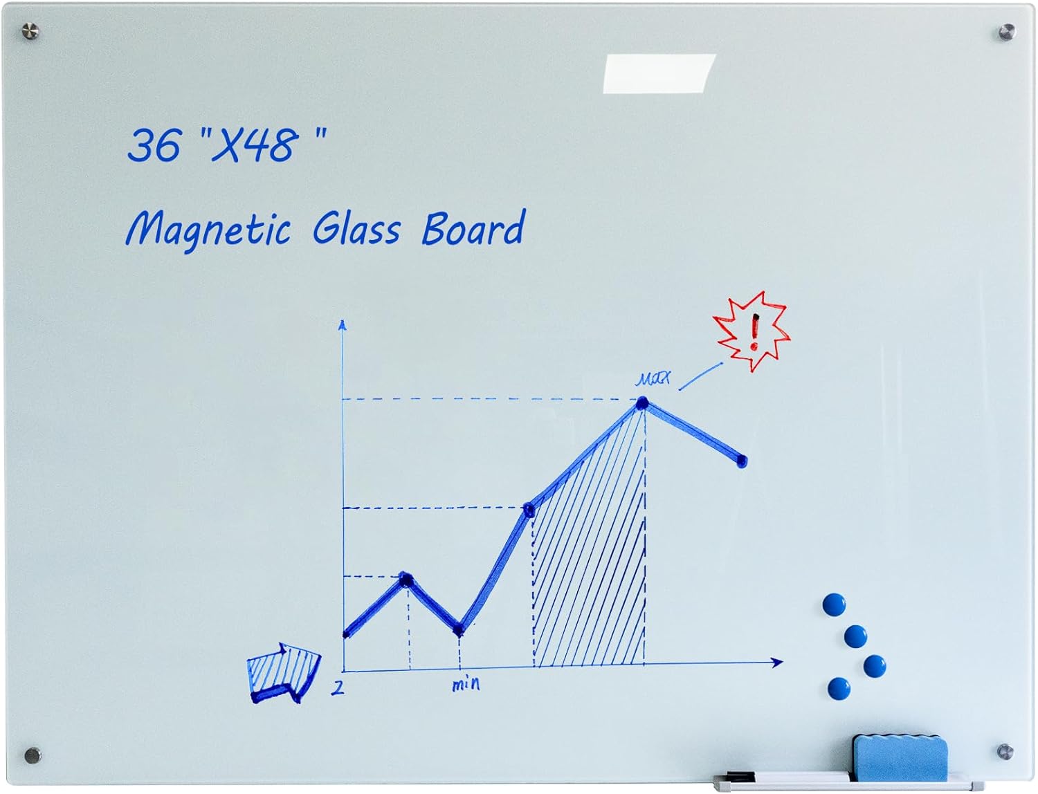 Magnetic Glass Whiteoard with Eraser 48" x 36" Frameless Tempered Glass Dry Erase Whiteboard with Marker Tray for Interactive Office, Wall Mounted Whiteboard (White)