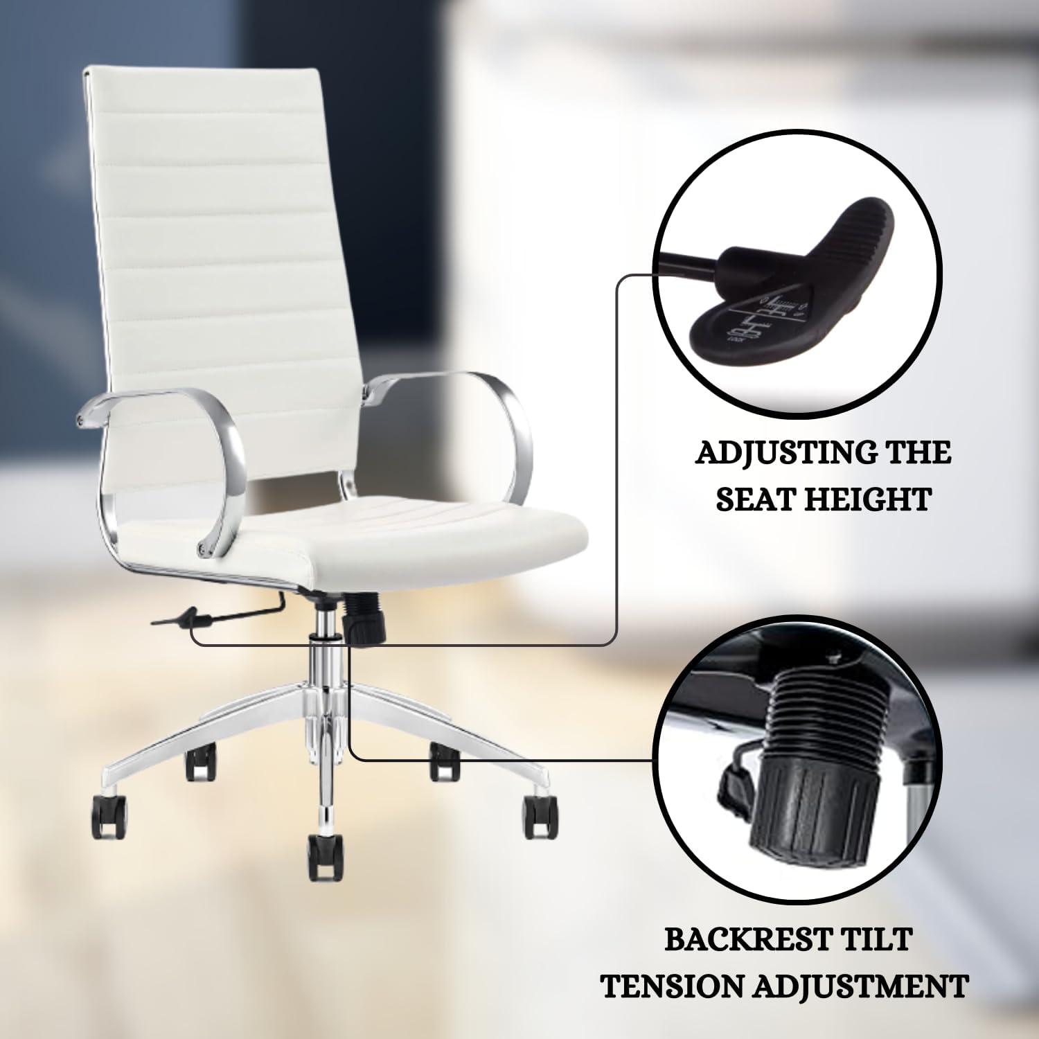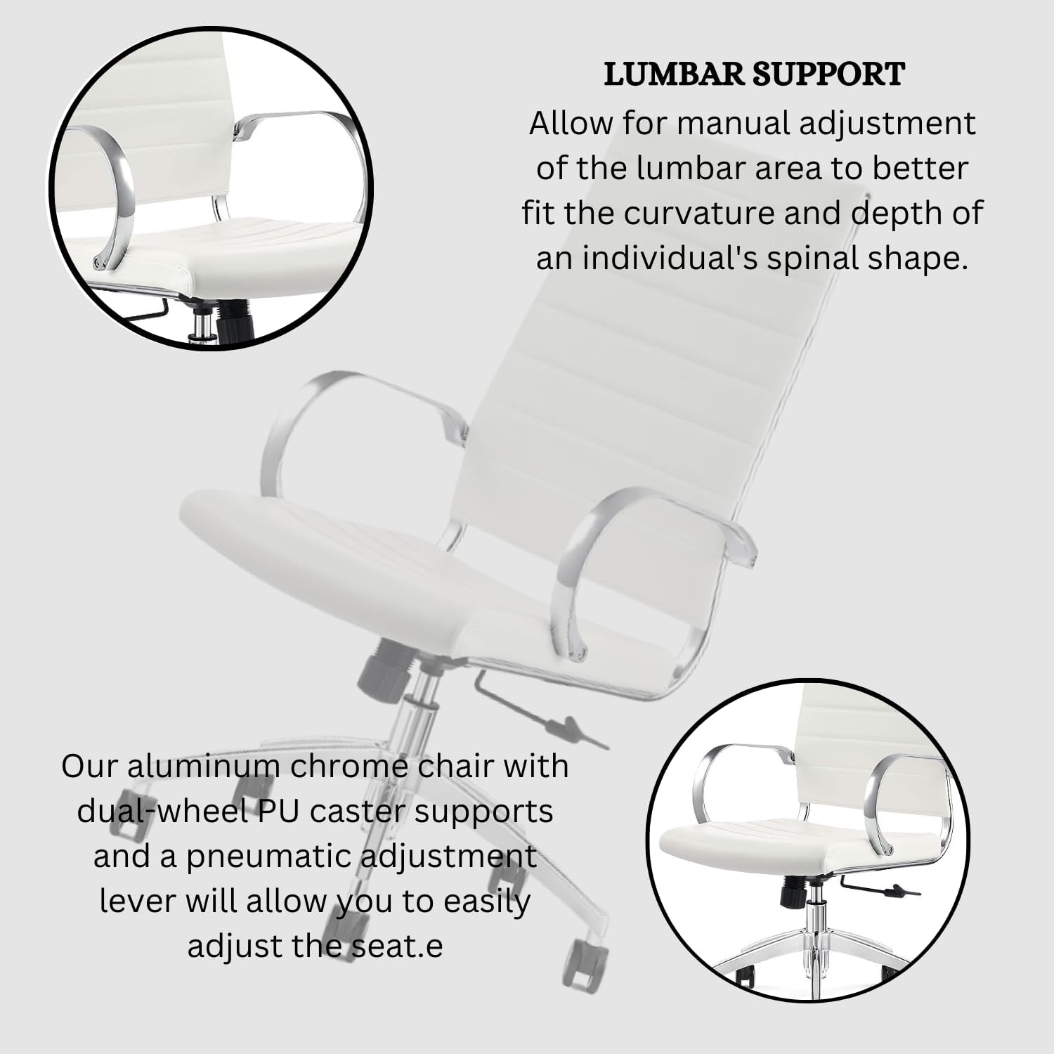 Ribbed High Back Conference Room Chairs - Lumbar Support, Modern Style Executive Home Office Chair - 360 Swivel Rolling Wheels - Aluminum Chrome Frame & Base- White Office Chair (Pack of 1)