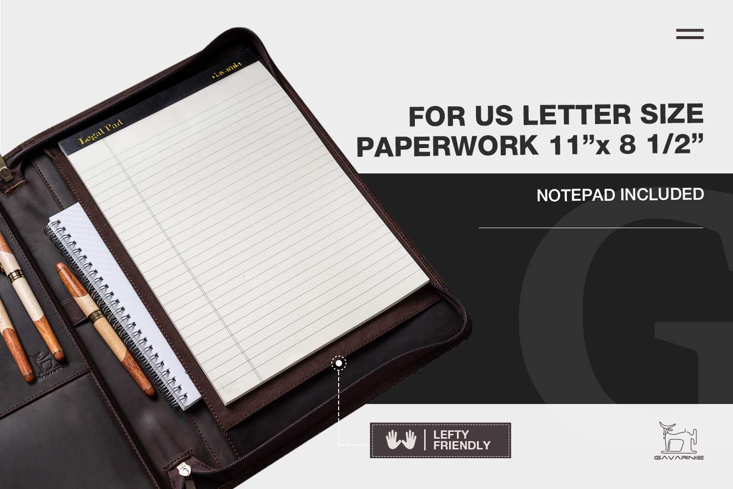 - GENEROUS PAPERWORK STORAGE. This leather padfolio for men designed for the standard US letter-sized 11”x 8 1/2” sheets, The organ pocket holds a big 1/2" stack of loose papers without tearing up the pages or folding them. The leather folder portfolio with notepad to fit right or left-handed users. This business leather portfolio organizer goes over well with most business people or students.