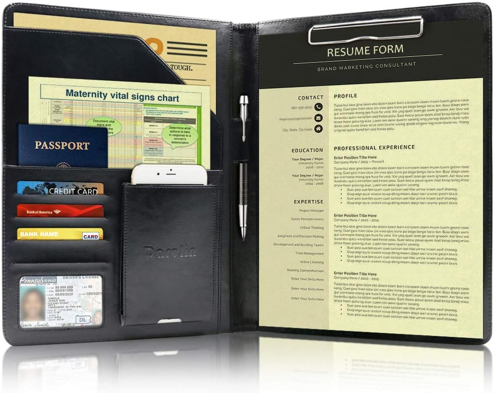 - [SLEEK & PROFESSIONAL] Make a strong first impression with this modern premium leather portfolio. Fits most briefcases and bags. Exquisite design and practical functions make this folder clipboard holder become the best gift for business clients, colleagues and family.