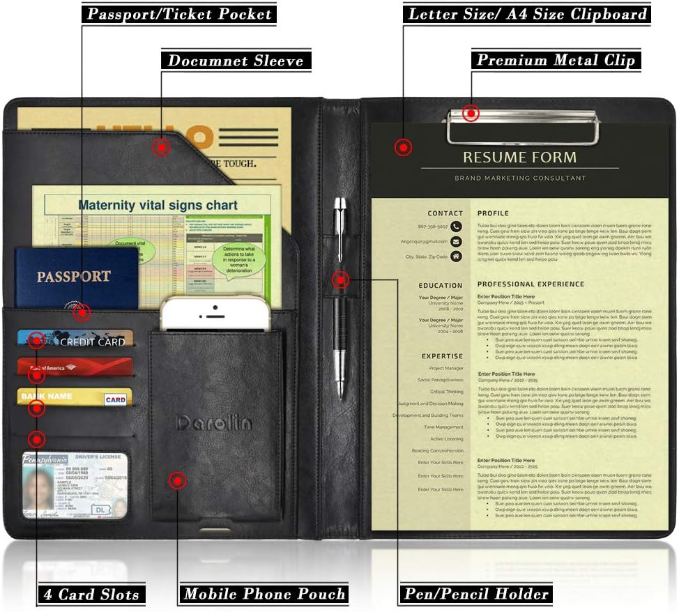 - [PRACTICAL & ORGANIZED] Darolin padfolio portfolio case designed with one metal clip, pen loop, cell phone holder, file pocket, bill pocket and 4 card holders. Various inside pockets and slots capable of holding documents, letters, notes, envelopes, mobile phone, pens, business cards and other stuffs, which facilitate your daily use and business travels, make your work or study more efficient.