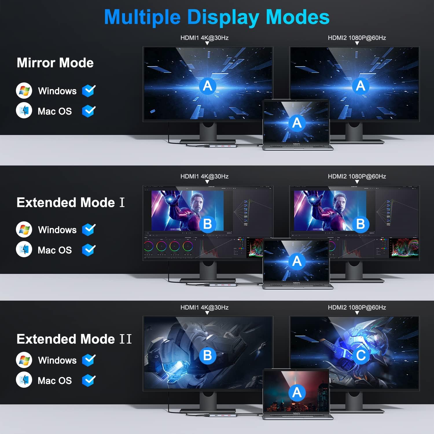 - 【Laptop Docking Station Dual Monitor for MacBook】The SELORE Docking Station supports mac OS MST, which can convert dual HDMI display to independent work mode. This allows you to work on two separate screens at the same time through this usb c hub, thus increasing productivity and comfort(PLEASE NOTE: The docking station requires a driver to be installed in order to function)