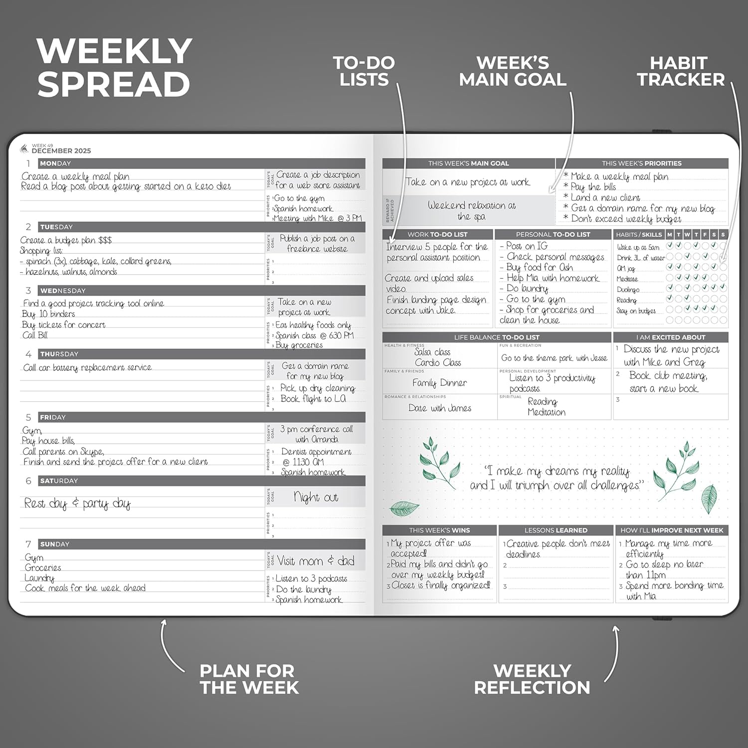- PLAN YOUR LIFE TO THE TINIEST DETAIL – Convenient large-format layouts include weekly and daily priorities, to-do lists, habit trackers, monthly calendars and progress reviews to help you plan each aspect of your busy life.