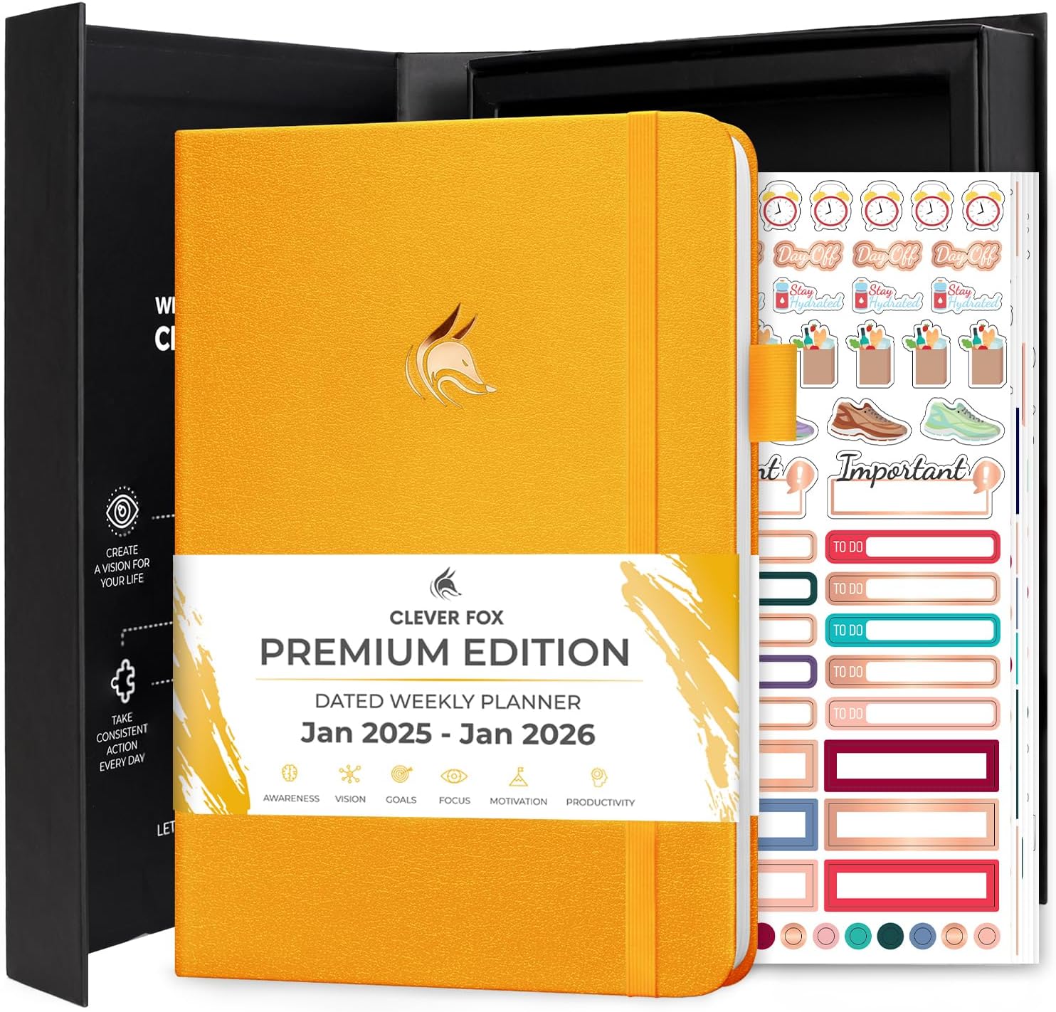 Clever Fox Dated Planner Premium 2025 – Weekly Agenda for Planning & Time Management –Notebook with Habit Tracker & To-do List (Amber Yellow)