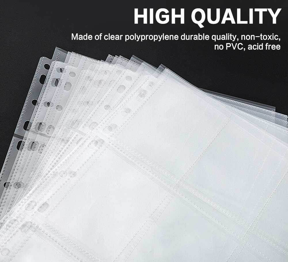 - Double Side Display: Total 900 pockets of 100 pages, 9-Pocket for each page protector. 100 pages, you can put two cards in one sleeve. Page protector fit for a standard 3-ring binder