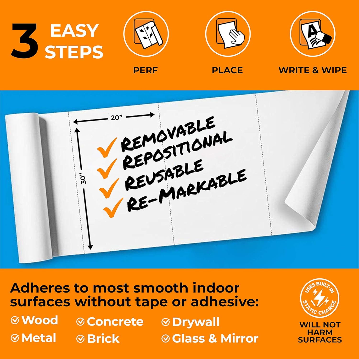Clingers Instant Whiteboards - Repositional Dry Erase Sheets, 40 Whiteboards per Roll, 20x30 Inch, Removable & Recyclable Cling-rite Rolls for School, Office Decor, and Art Projects - American Made