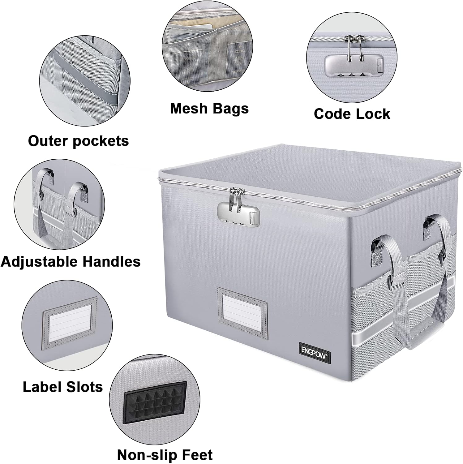 ENGPOW File Box with Lock, Fireproof Document Box with Zipper&Pockets, Collapsible File Organizer Filing Storage Cabinet with Handle, Portable Home Office Safe for Hanging Letter/Legal Folder,Silver