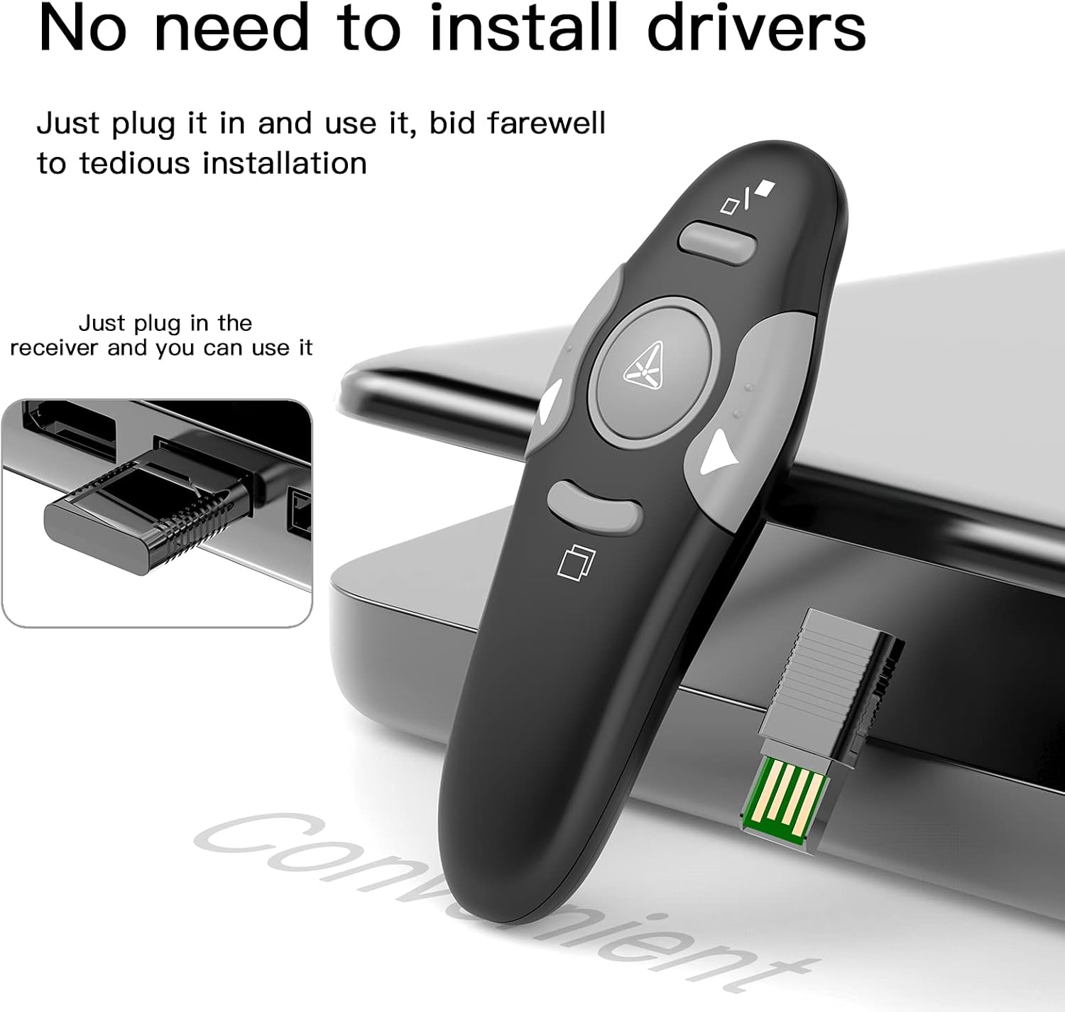 - Easy to Plug & Play--No need to do any special setup. Just put in an AAA battery (not included in the package), fetch the receiver (fits USB 1.1/2.0) under battery cover and plug it into your devices. Small and lightweight, the powerpoint clicker is comfortable in your hand and easy to store.