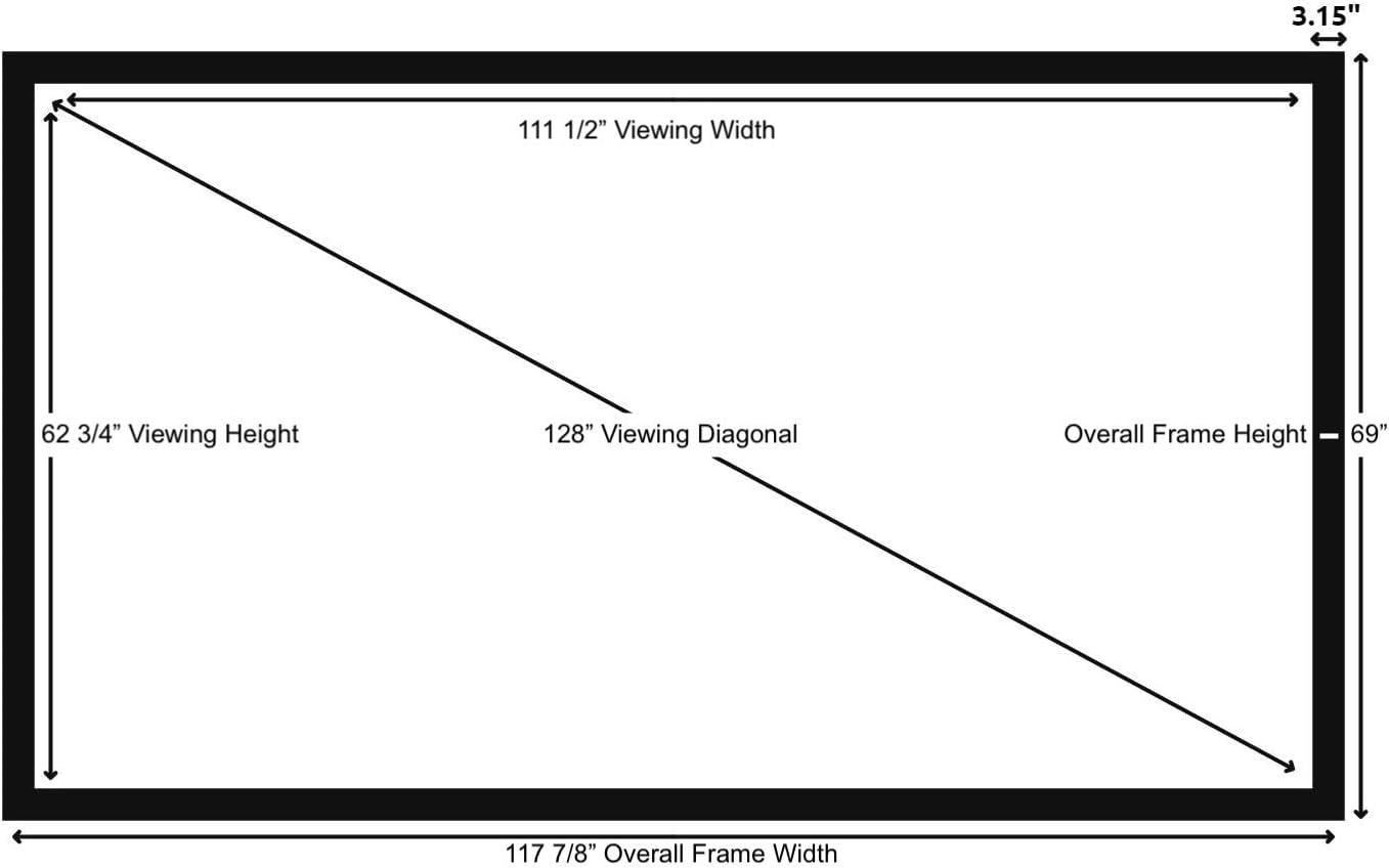 - Wall Mounted Fixed Frame Projection Screen (Overall Size 69" Tall x 117.875" Wide) (Viewing Area 128" Diagonal x 62.75" Tall x 111.5" Wide) No option for Legs or Stands with this product. Recommended for projectors with Native 16:9 Resolution