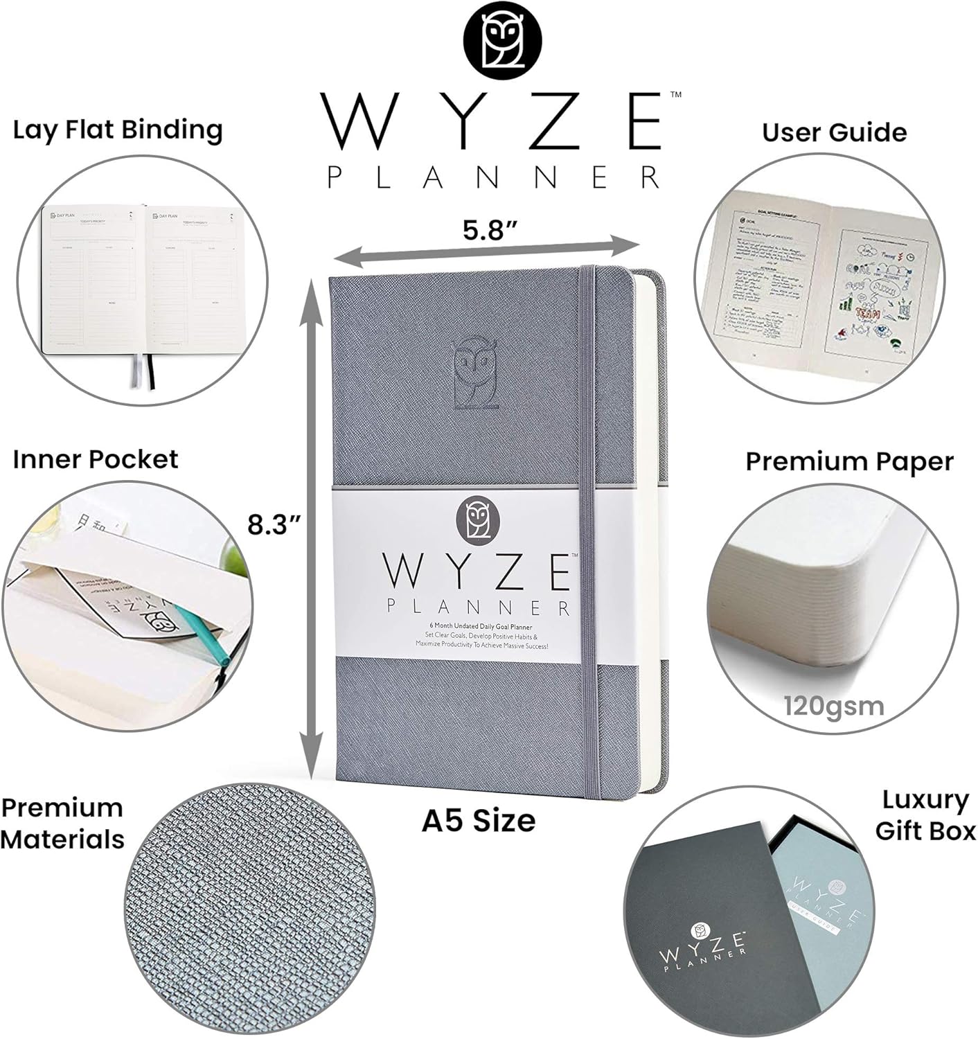 Undated Daily Planner – 6-Month A5 Productivity Organizer with Full Page Per Day, Hourly Schedule, Goal Setting, Habit Tracker, Weekly & Monthly Pages – Hardcover Time Management Notebook (Gray)