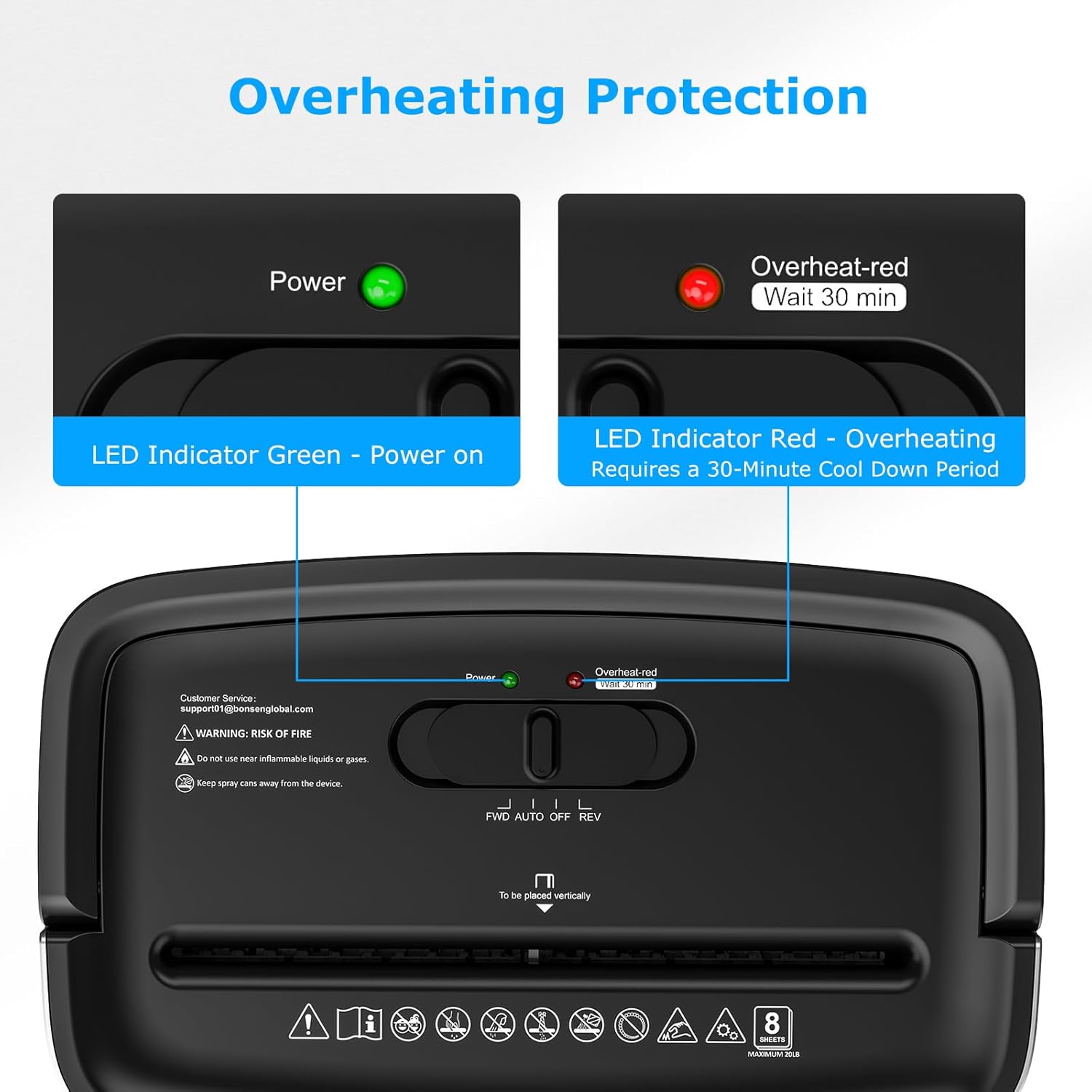- Overheating Protection & Anti-Jam System: 4 mode control switch (Forward, Auto, Off, Reverse) and LED light indicators (Power On, Overheat); Overheating (Red Light On) protection makes it safer to use; Anti-jam system helps to clear paper jams