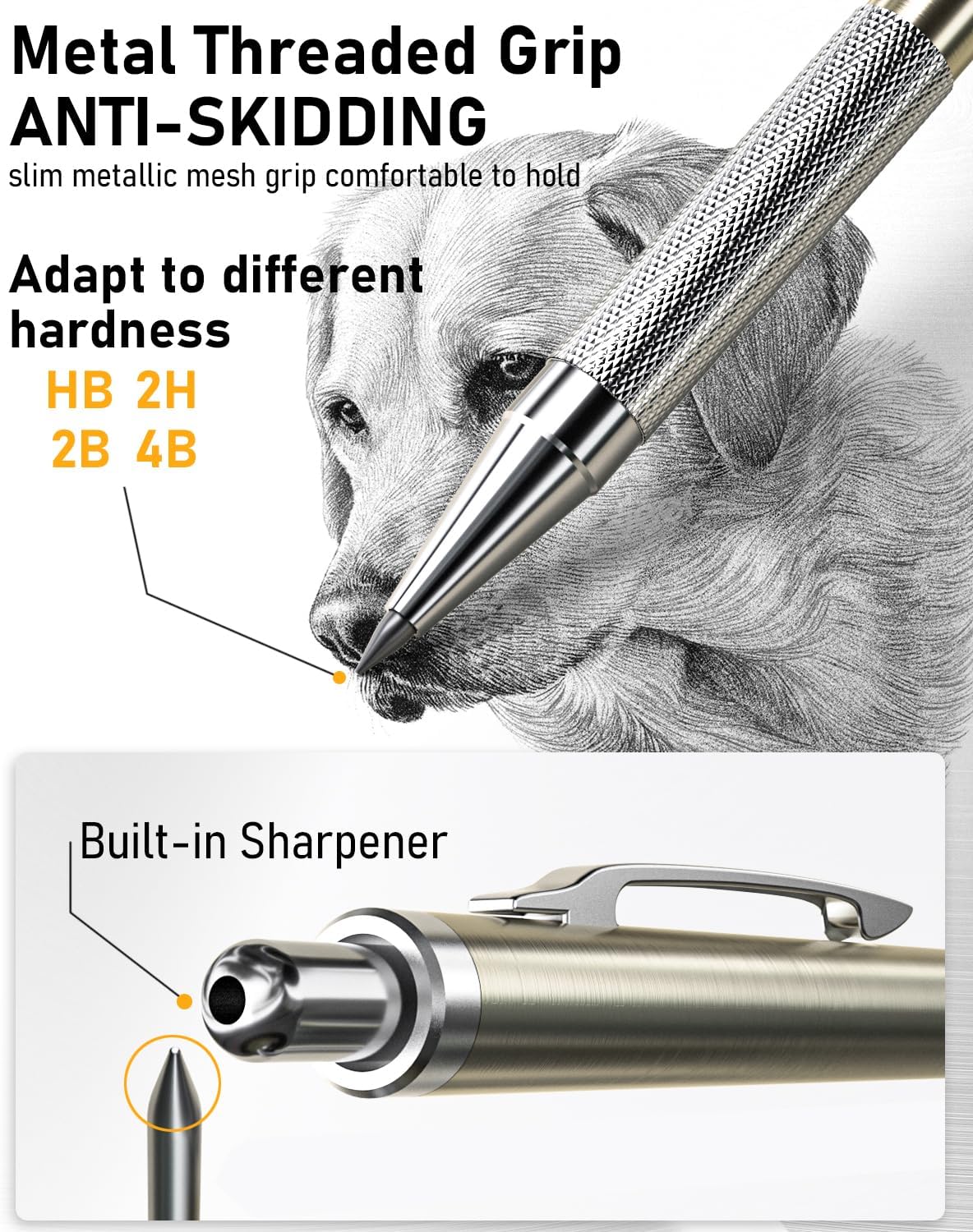 - 2 PCS 2mm Lead Holder: Metal Threaded Anti-skidding pen tube with sharpener in the cap of 2.0 mm mechanical pencil, Extra 2pcs lead sharpener are also provided for the 2.0 lead to keep the fine point as they dull.