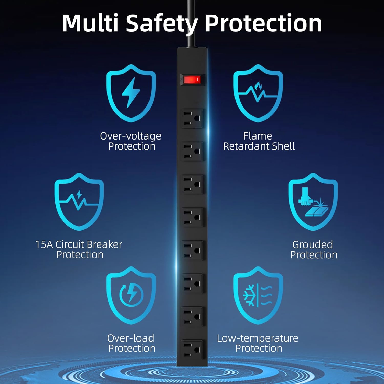 - OVERLOAD PROTECTION:A power switch with lighting has a built-in high quality 15A circuit breaker for overload protection. When the operating current exceeds the rated current, this power strip automatically cuts off the power supply from spikes, fires or other unsafe conditions.