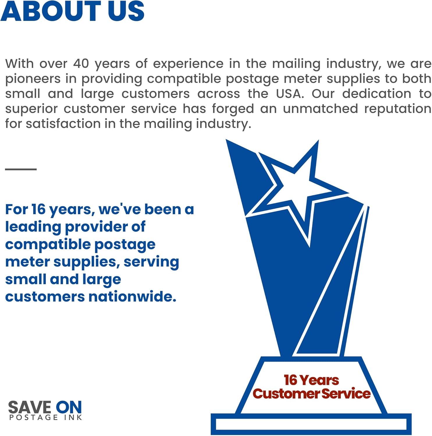 - ABOUT US - SAVE ON POSTAGE INK: Our company is a leader in the postage meter supplies industry that sells supplies all over the United States. We have over 36 years of experience in the mailing industry, and our main focus is our commitment to superior service and customer satisfaction. Our focus has helped us establish an unequaled reputation within the mailing industry.