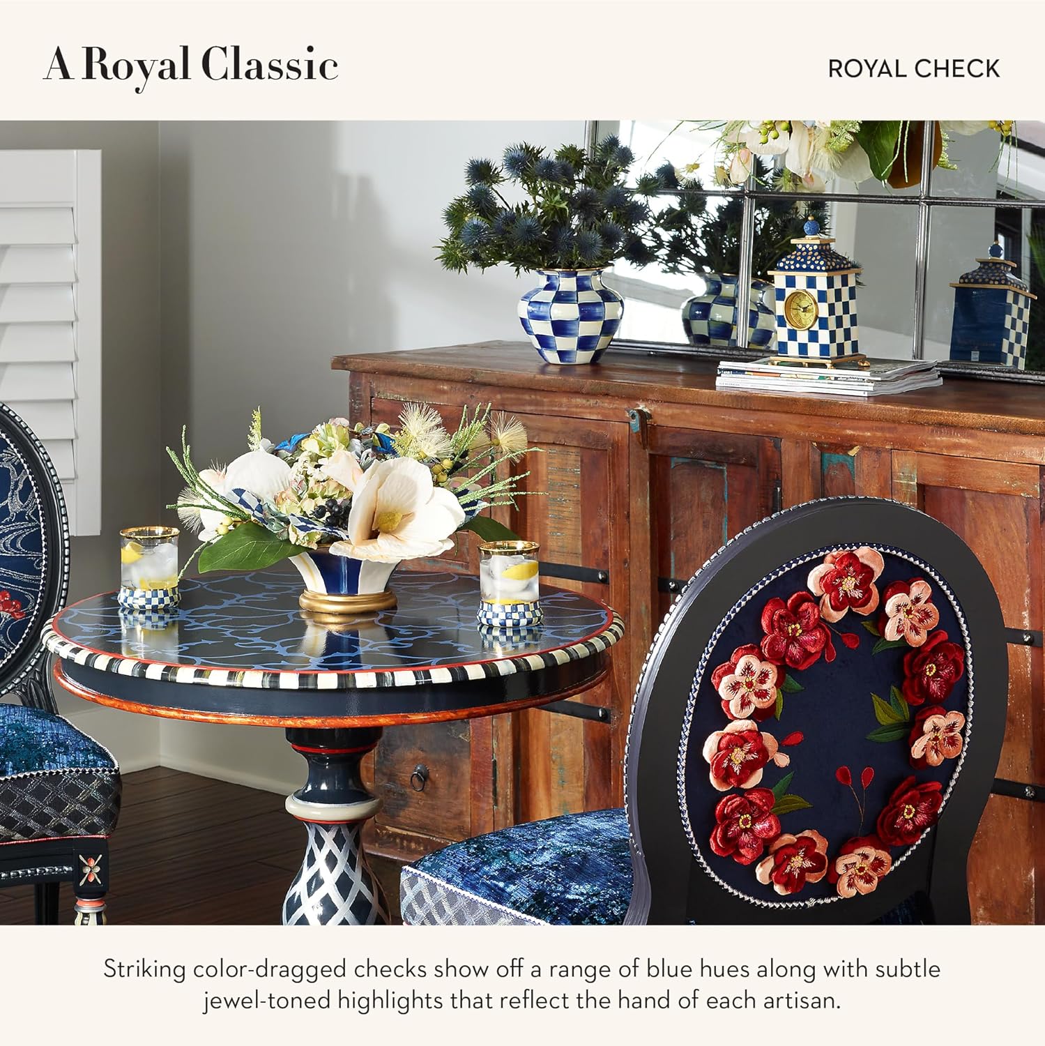MACKENZIE-CHILDS Desk Clock, Decorative Wood Clock for Kitchen and Living Room, Blue-and-White Royal Check