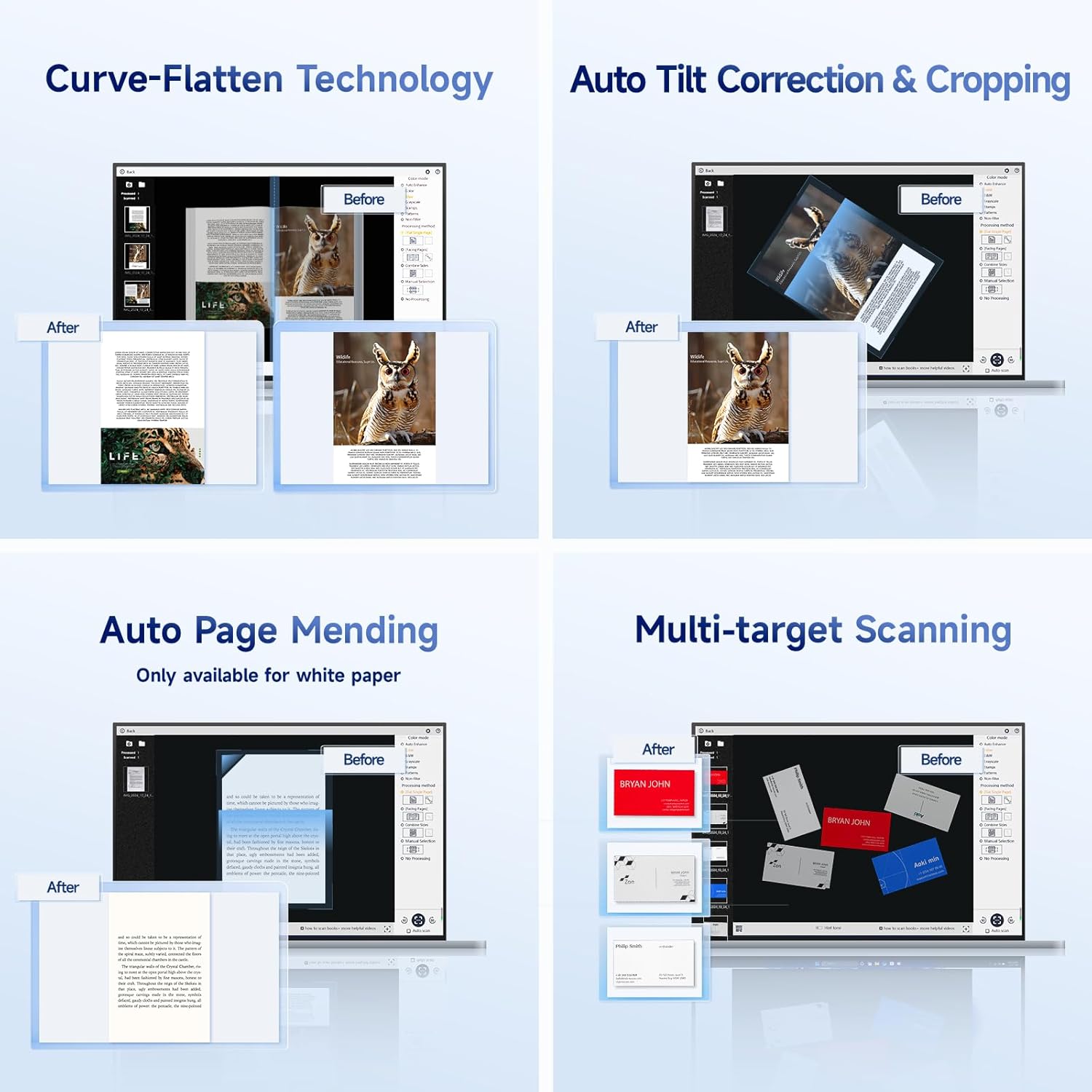 - Patented Flattening Curved Book Page Technology: Shine Ultra applies CZUR’s patented technology to flatten the curved surface after pixel transformation to flattening of the book page (Only suitable for thinner books, ET series is recommended for thicker books)