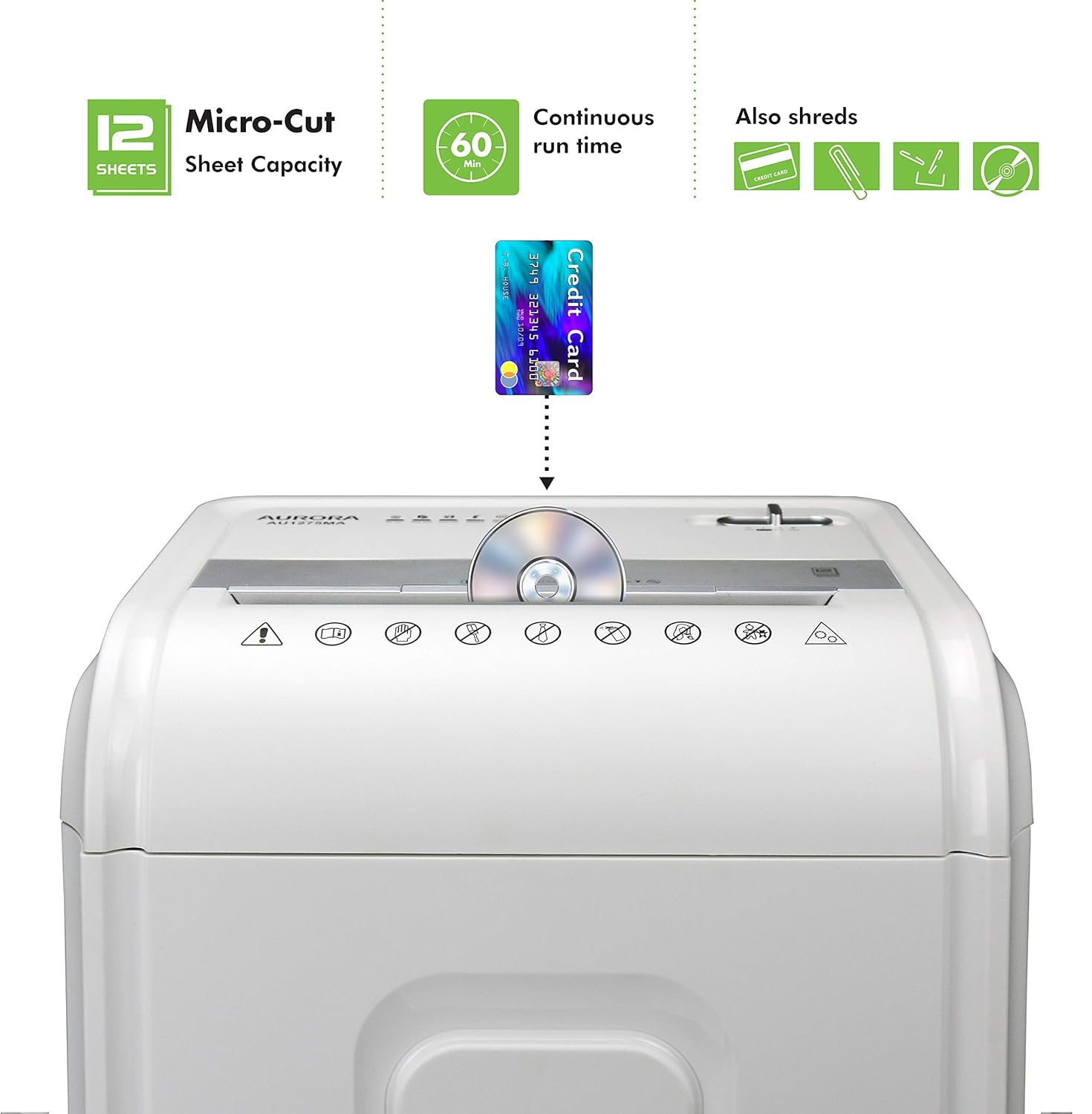 Aurora AU1275MA Professional Grade 12-Sheet Micro-Cut Paper and CD/Credit Card Shredder/ 60 Minutes Continuous Run Time, White/Gray