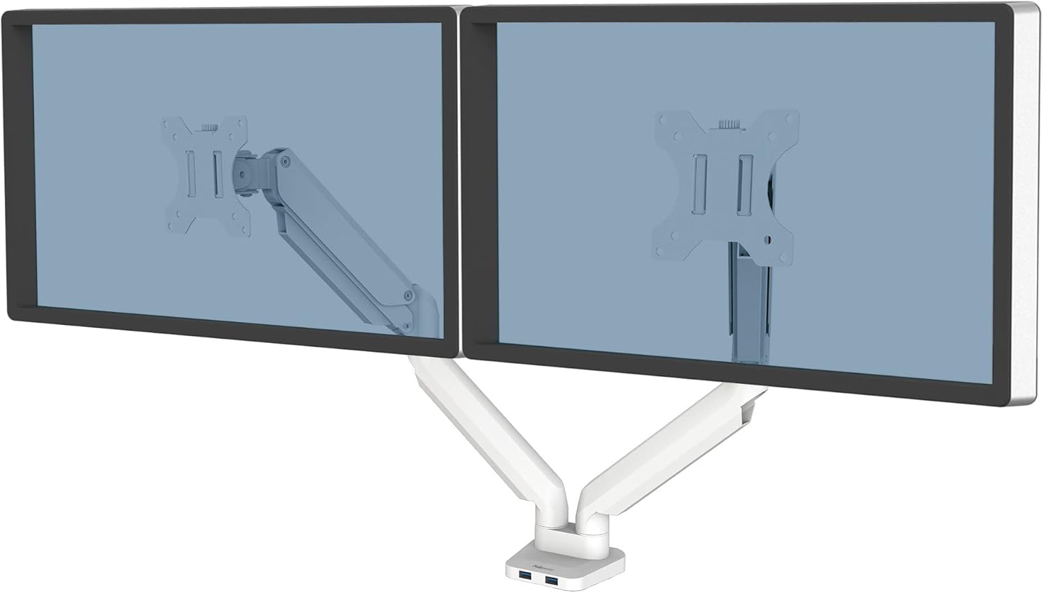 Fellowes Platinum Series Dual Monitor Arm for 40-Inch Monitors, Full Motion, 360° Rotation, VESA Mount with Grommet or Clamp, USB Ports, Ergonomic, White, 8056301