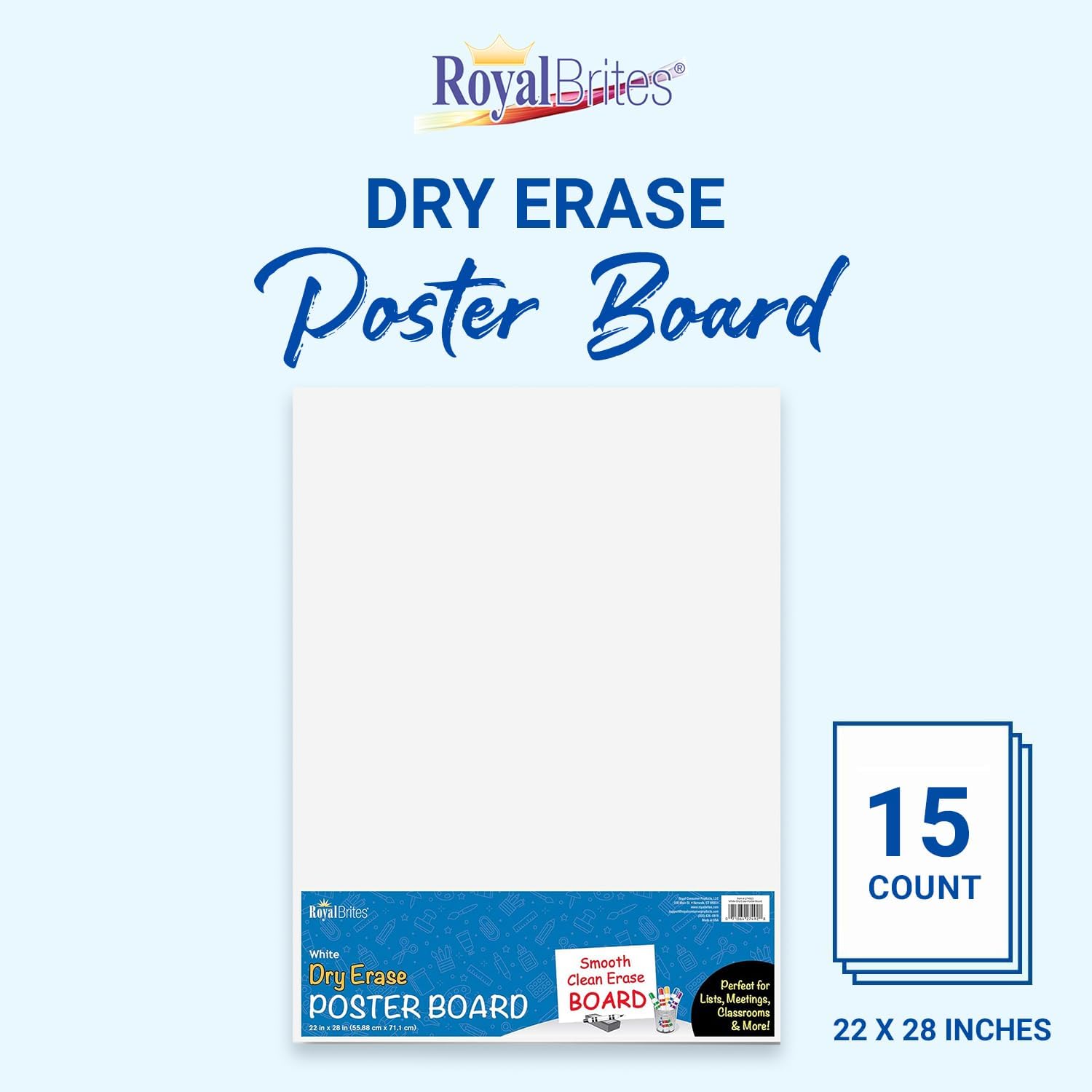 Royal Brites Dry Erase White Poster Board 22x28”, Lightweight & Ideal for Classrooms, Offices, Arts & Crafts, 2-Sided Premium 22x28 Poster Board White, Pack of 15