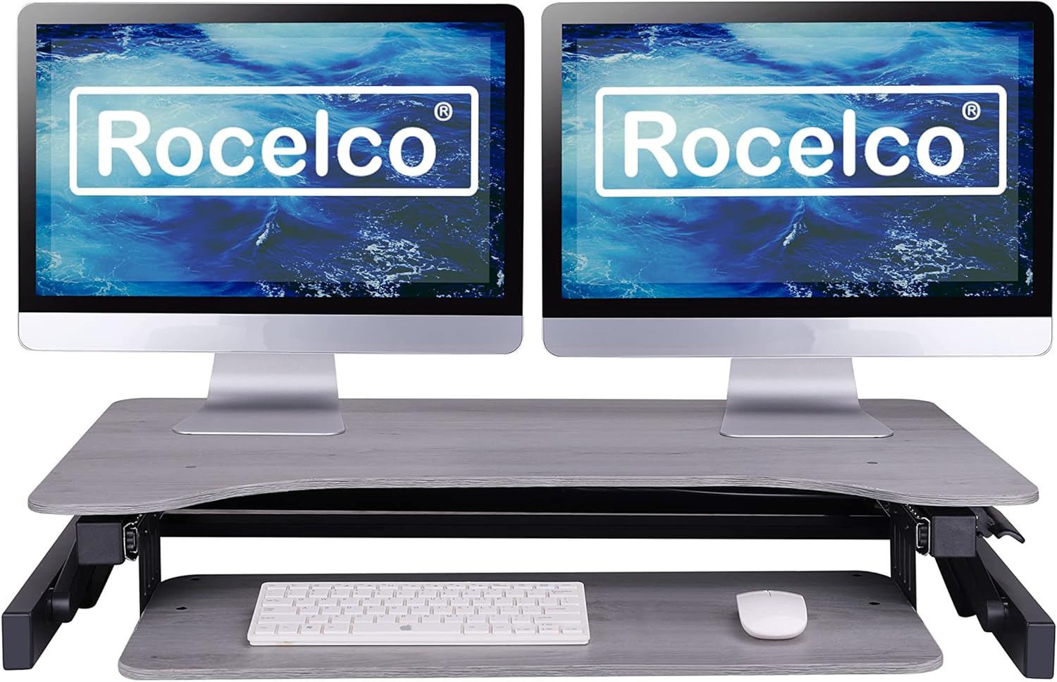 Rocelco 37.5" Height Adjustable Standing Desk Converter with Dual Monitor Mount and Slide Out Retractable Keyboard Tray - Sit Stand Up Double Screen Tabletop Riser Workstation - Gray (R DADRG-DM2)