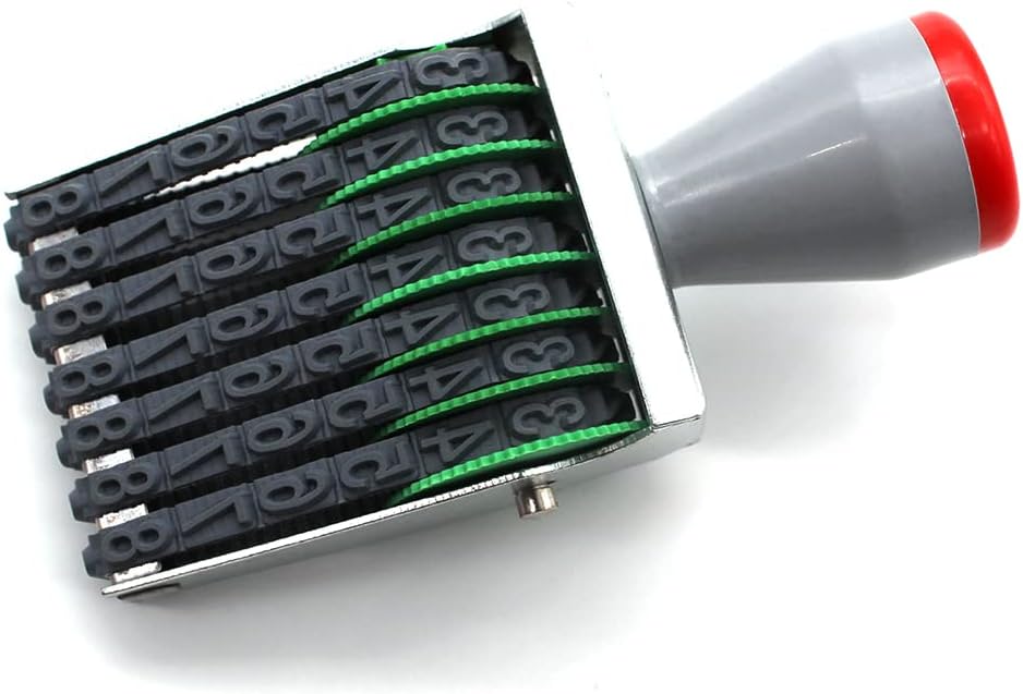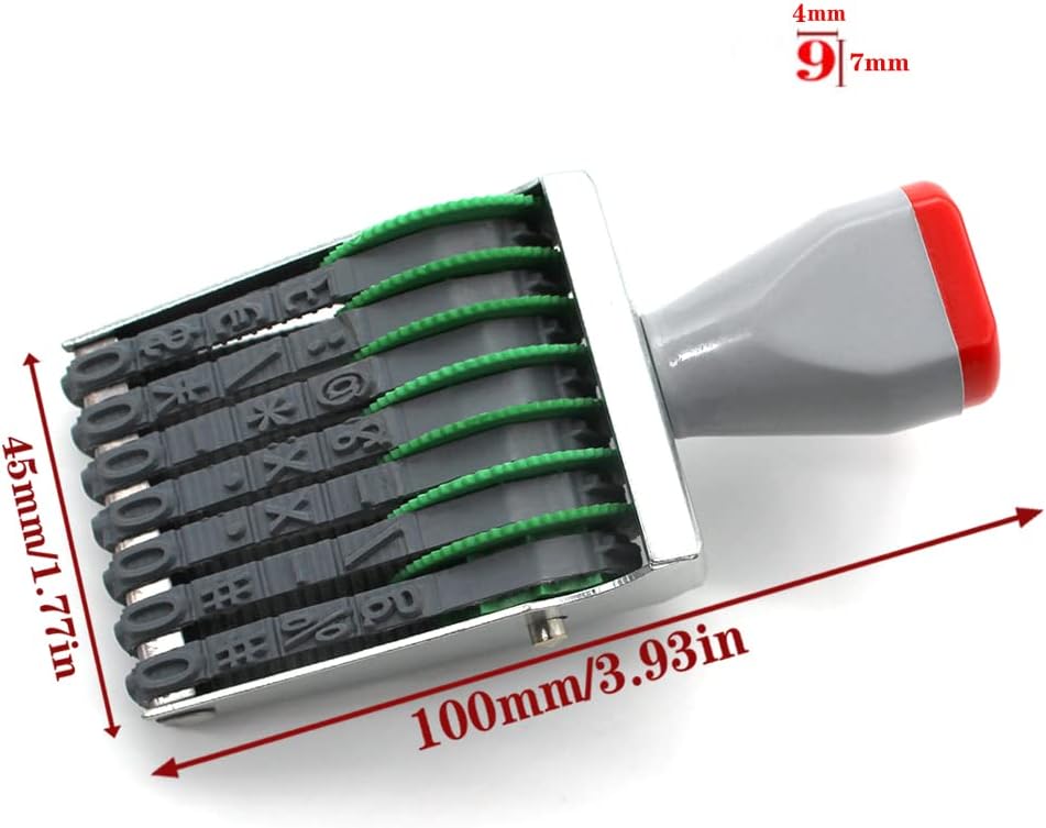 - Traditional 7-digit Number Roller Stamps, Material: Metal, Rubber, Plastic; Size: Length 100 mm , Width 45 mm / 1.77 inch ,Height 25 mm / 0.98 inch; Character: Width 7 mm / 0.27 inch , Height 10 mm / 0.39 inch; Color: Grey Black; Weight: 65 g; Package Content: 1 X Numbering Stamp Without Ink; Requires a ates ink pad