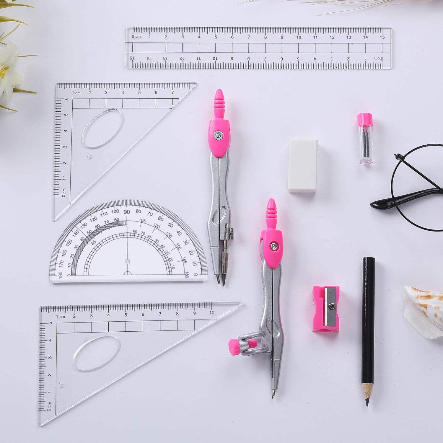 Math Geometry Kit Sets 10 Piece Student Supplies with Shatterproof Storage Box,Includes Rulers,Protractor,Compass,Eraser,Pencil Sharpener,Lead Refills,Pencil,for Drafting(Pink)