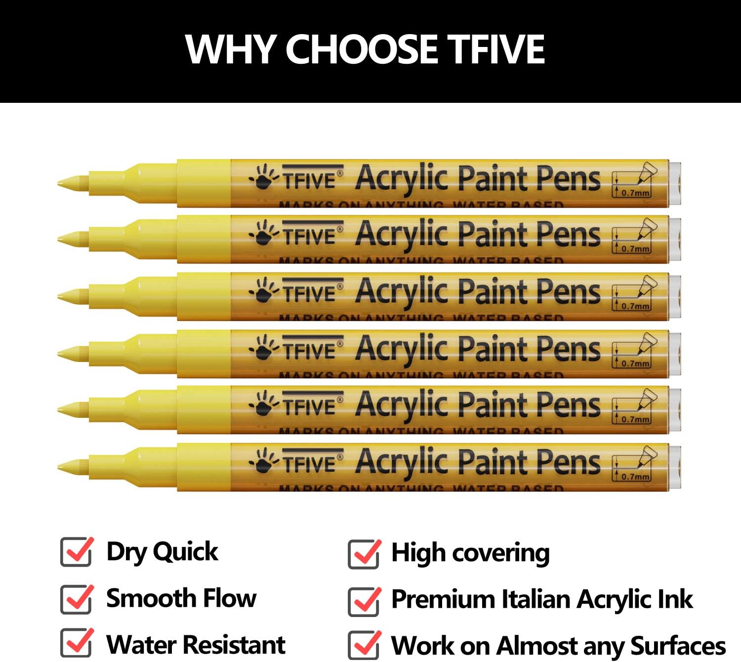 - SMOOTH & PRECISE WRITING: With 0.7 mm pen tips, the yellow paint pen is specially designed with a wear-resistant and pressure-resistant chisel tip, that allows for precise control and helps to achieve fluid and smooth clear writing. The pigment ink is waterproof, chemically stable and quick-drying