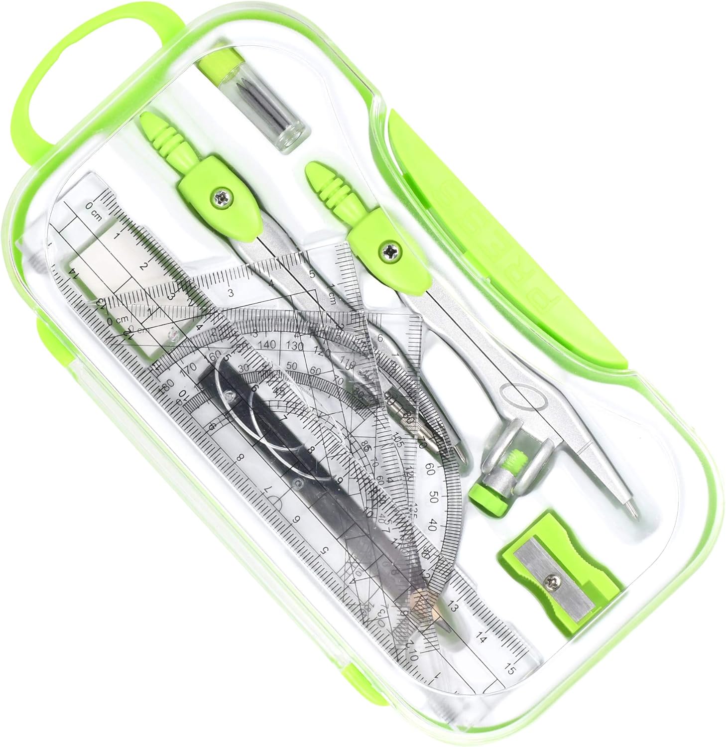 10 Pieces Math Geometry Kit Set Student Supplies with Shatterproof Storage Box,Includes Rulers,Protractor,Compass,Eraser,Pencil Sharpener,Lead Refills,Pencil,for School and Drawings(Green)