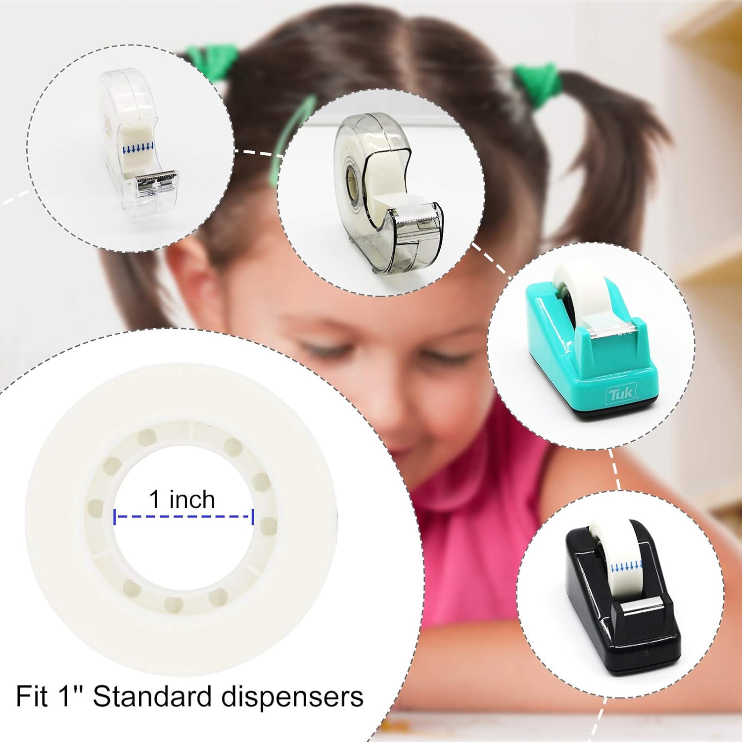 - 【Fit standard dispensers】Each roll 1" core design fits perfectly for your tape dispensers. The tape is extremely easy to cut in the tape dispensers, and end of the tape are torn evenly