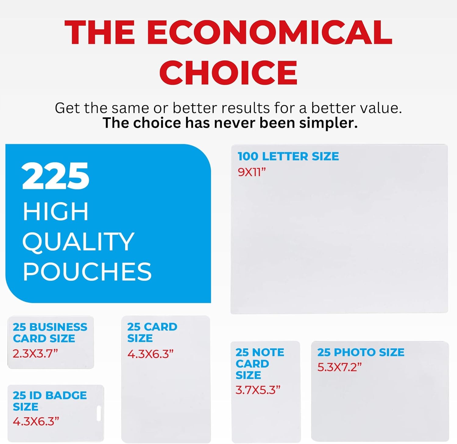 5MIL Thermal Laminating Sheets (225 Count) Letter, Photo, Card, Notecard, ID Badge and Business Card Sizes, Laminating Pouches, Compatible with Laminators, Crystal Clear Laminated Finish