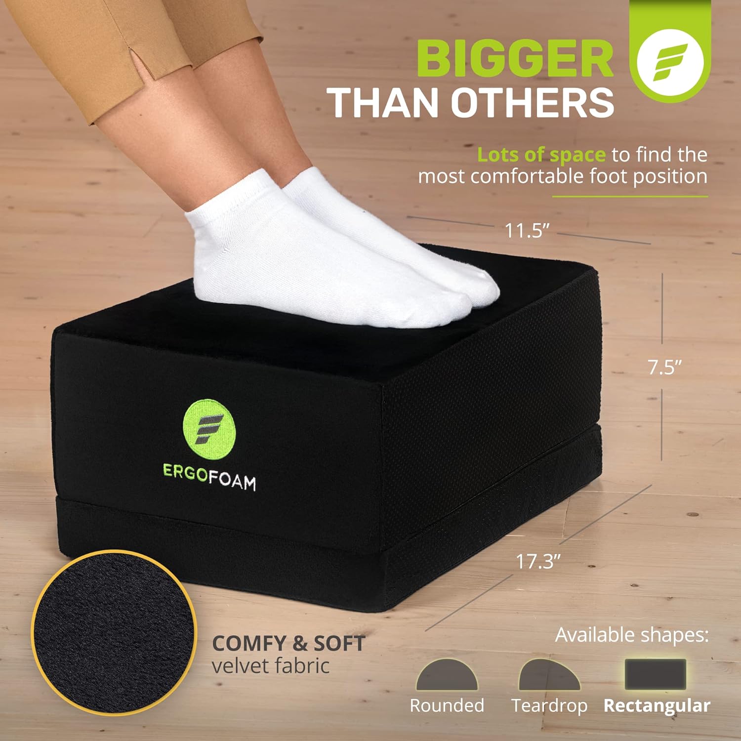 - THE AVERAGE OFFICE FOOT REST is great for the first fifteen minutes, but then starts to FLATTEN OUT due to LOW-QUALITY FOAM that’s too soft and flimsy. Our high-density ErgoFoam was developed to MAINTAIN ITS SHAPE and FIRMNESS over time, RESISTING COMPRESSION under the weight of your legs and feet – and providing better support than memory foam foot rest s. With a DOUBLE-SIDED NONSLIP BOTTOM, this under desk foot stool stays put and won’t slide around on your floor.