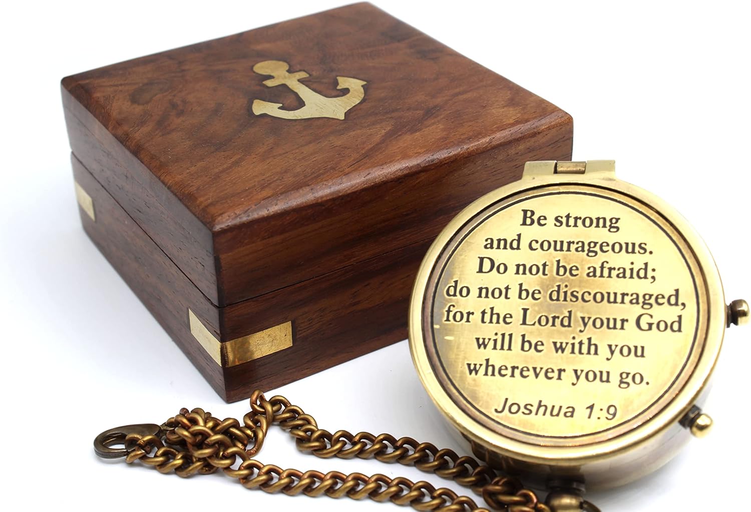 Be Strong and Courageous Compass – Antique Nautical Magnetic Compass with Engraved Scripture Quote – Baptism Gift with Wooden Box for Son, Father, Husband, Loved One