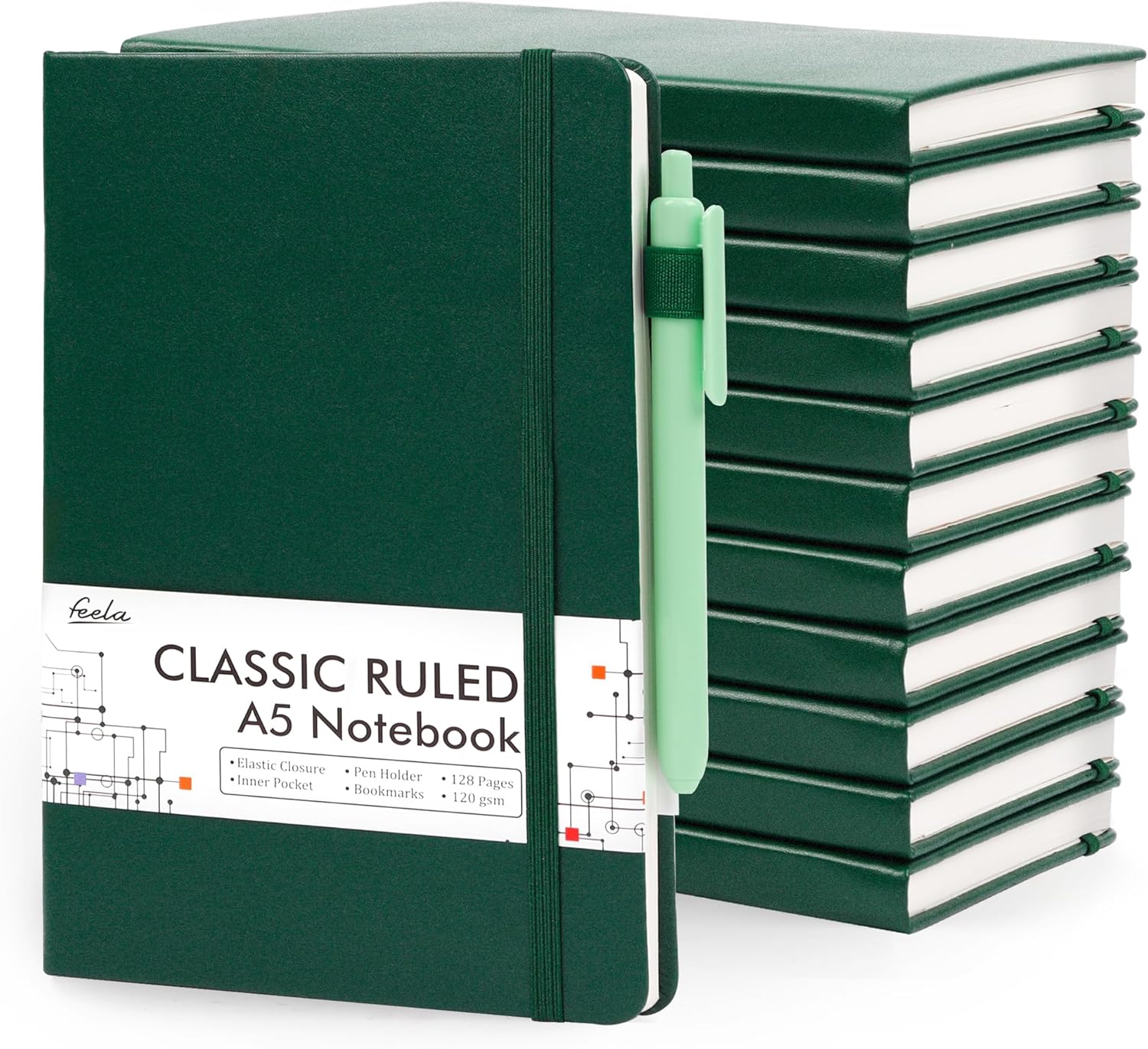 feela 12 Pack Notebooks Journals Bulk with 12 Black Pens, A5 Hardcover Notebook Classic Ruled Journal Set with Pen Holder for School Business Work Travel Writing, 120 GSM, 5.1”x8.3”, Dark Green