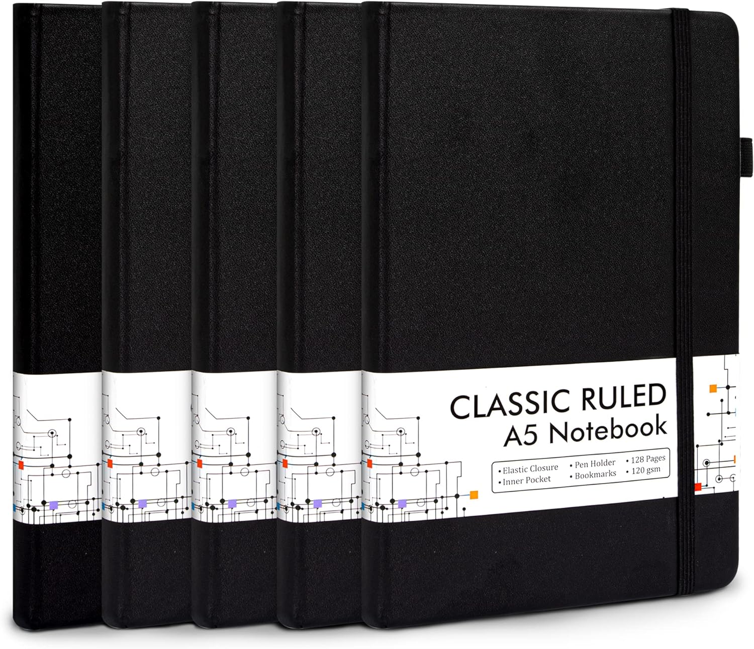 - Feela 5 Pack Classic Ruled Notebooks contains 5 classic black ruled sturdy cover notebooks and 5 Black Retractable Pens. Each of the notebooks measures 8.3” x 5.1”, which is perfect to carry and easily held by young girls and boys. These black cute pens are customized to be placed in the pen holder, which is pretty convenient.