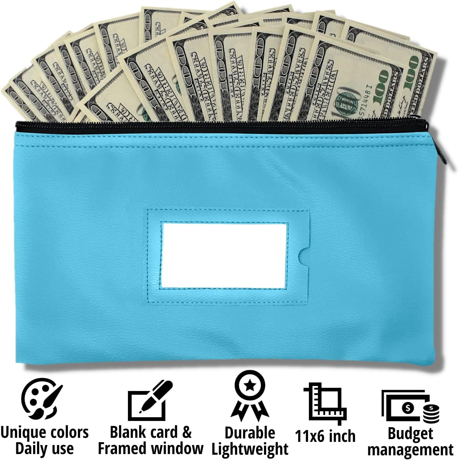 Money Bank Deposit Bag with Zipper | 11x6 inch | Light Blue | Durable Leatherette Money Cash Coin Check Wallet Pouch for Men & Women with Framed ID Window and Blank Card | by GIDABRAND (1)