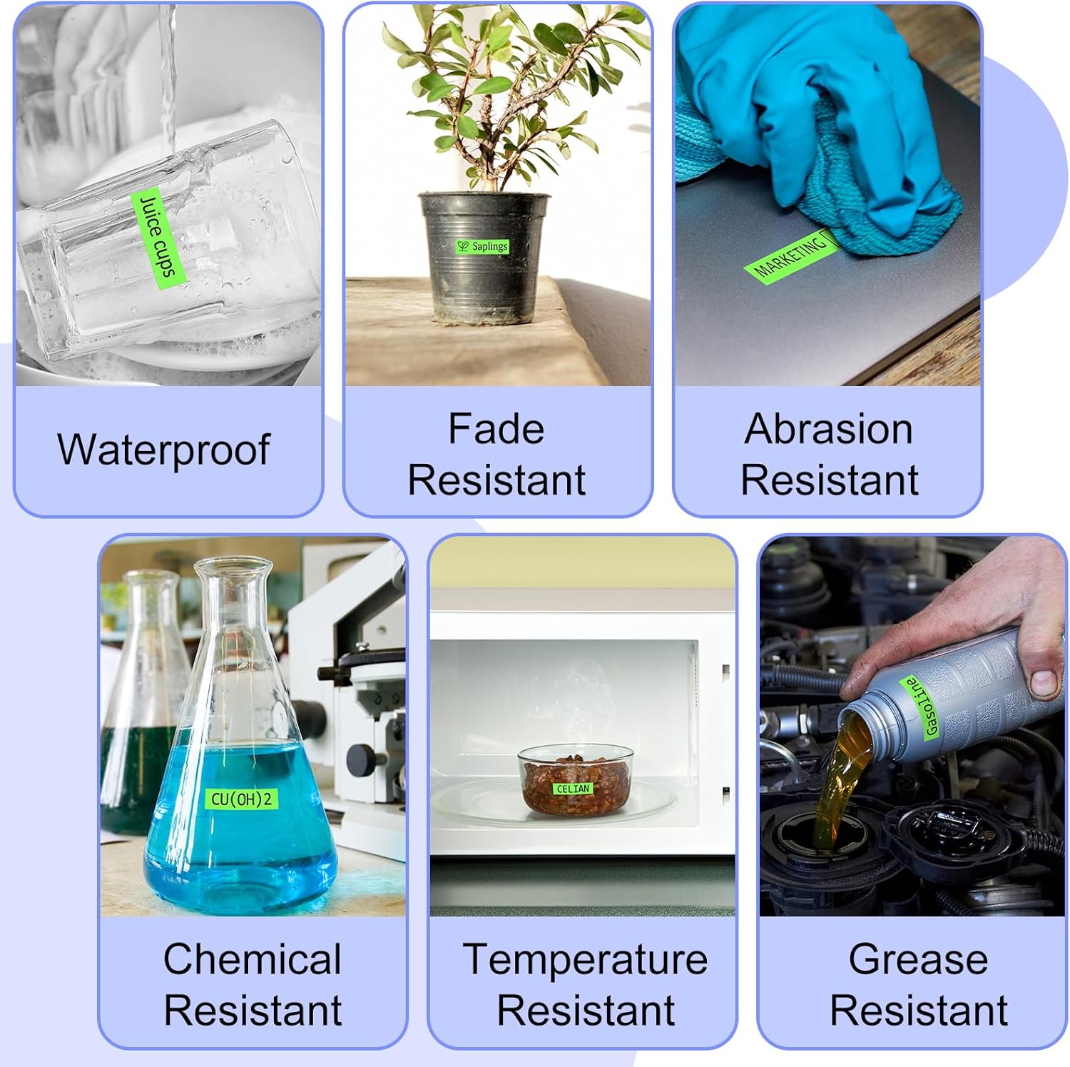 - Label features: print crisp and bold text with those durable labels making identifying and labeling things easy and hassle-free. Easy to peel with split backing and won't leave residue after removed. Water resistant, fade resistant, abrasion resistant, chemical resistant and temperature resistant.