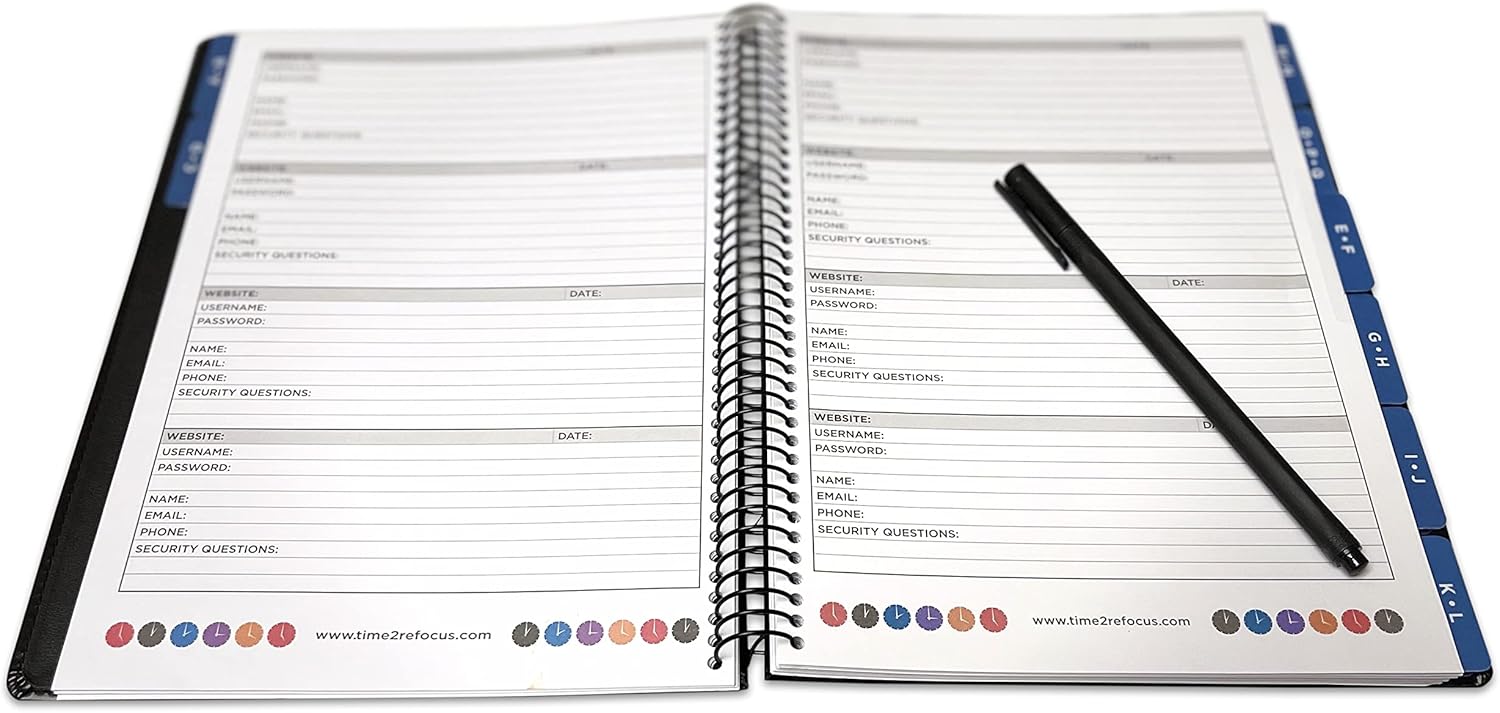 - ALPHABETICAL TABS: organized alphabetically with two letters per tab except O, P, Q and X, Y, Z have three letters per tab. Each tab has 12 pages with 4 password entries per page.