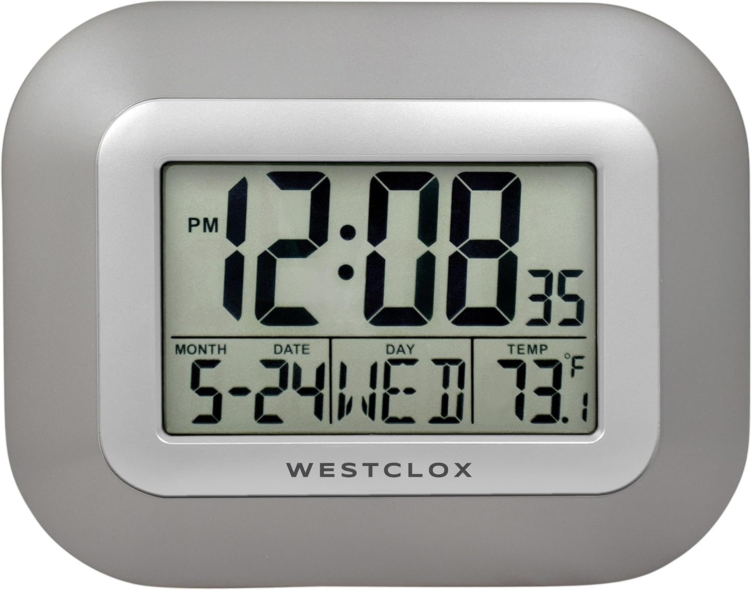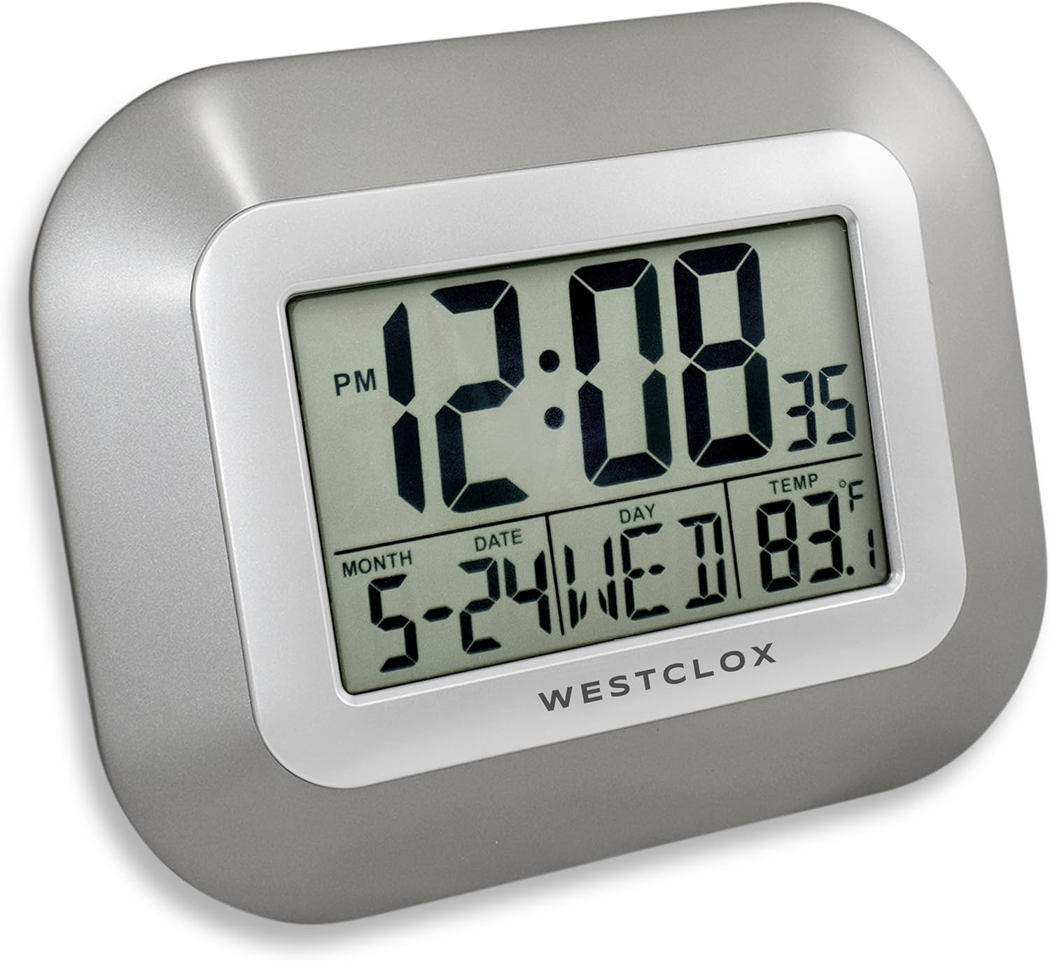Westclox Large Digital Wall Clock Battery Operated Large Digital Clock with Temperature Date and Day of Week with Alarm | Modern Digital Desk Clock for Office Kitchen Bedroom or Living Room | Silver