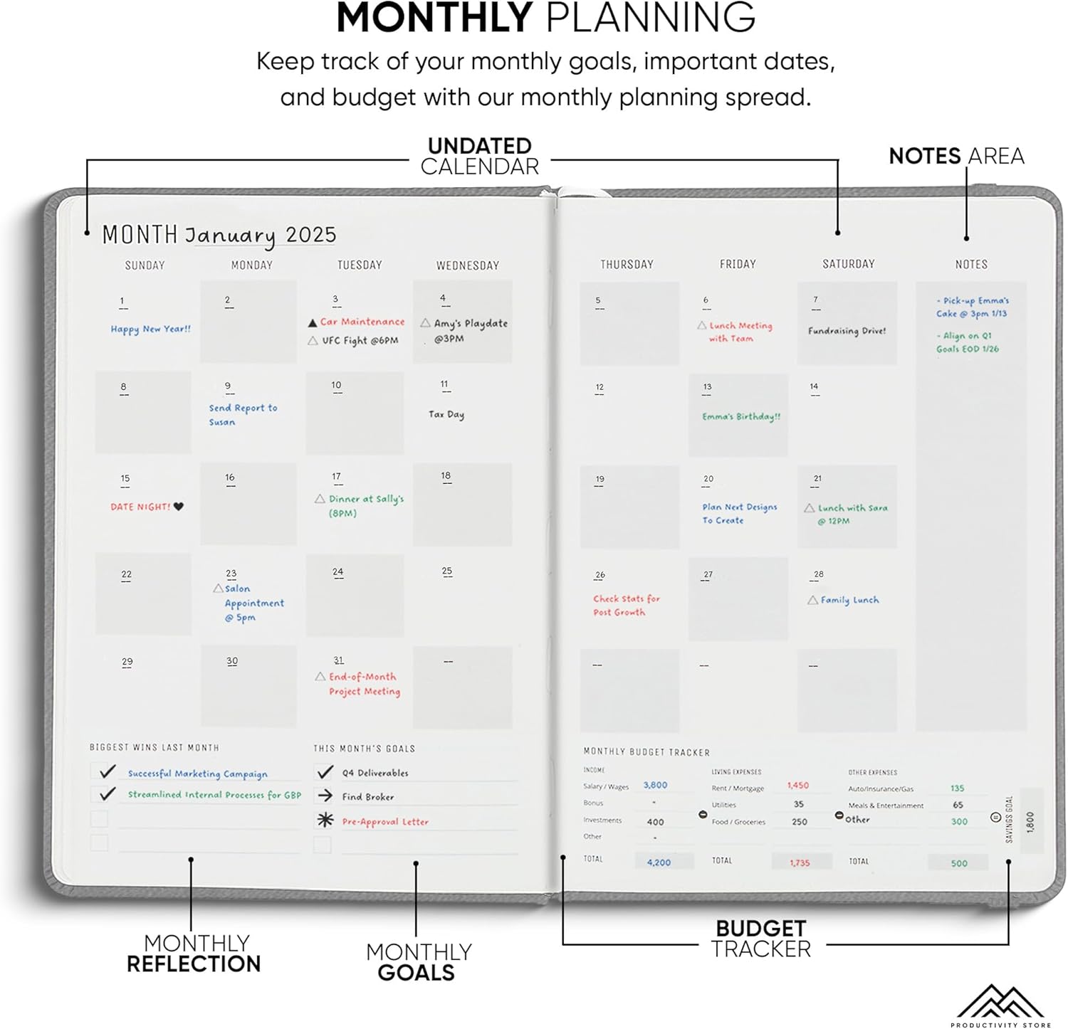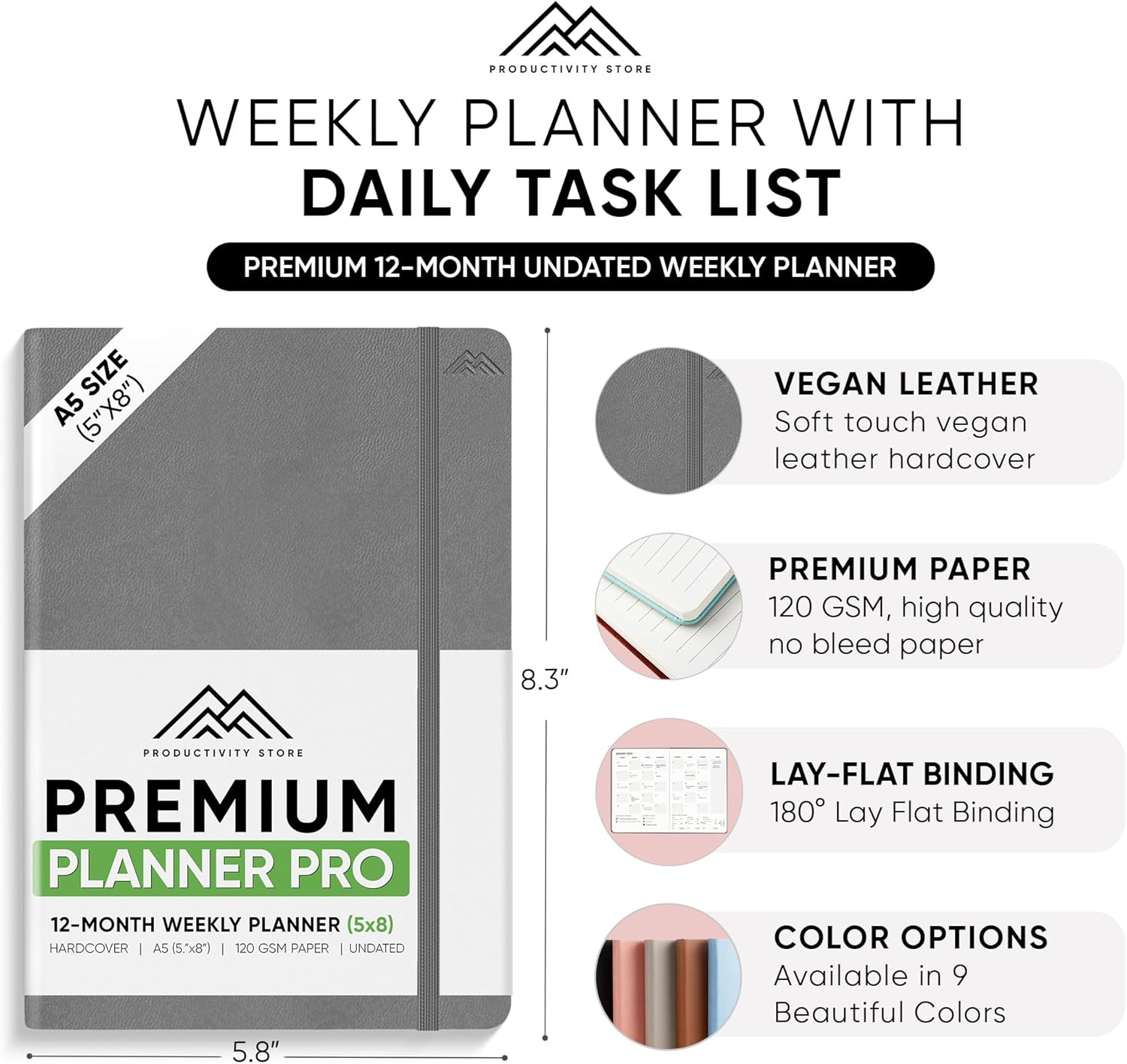 2025 Planner Pro 5.8 x 8.3 - Undated Productivity & Business Planner Notebook & Journal - Monthly Planner 2025 & Daily Planner 2025-2026 - A5 - Grey - Productivity Store