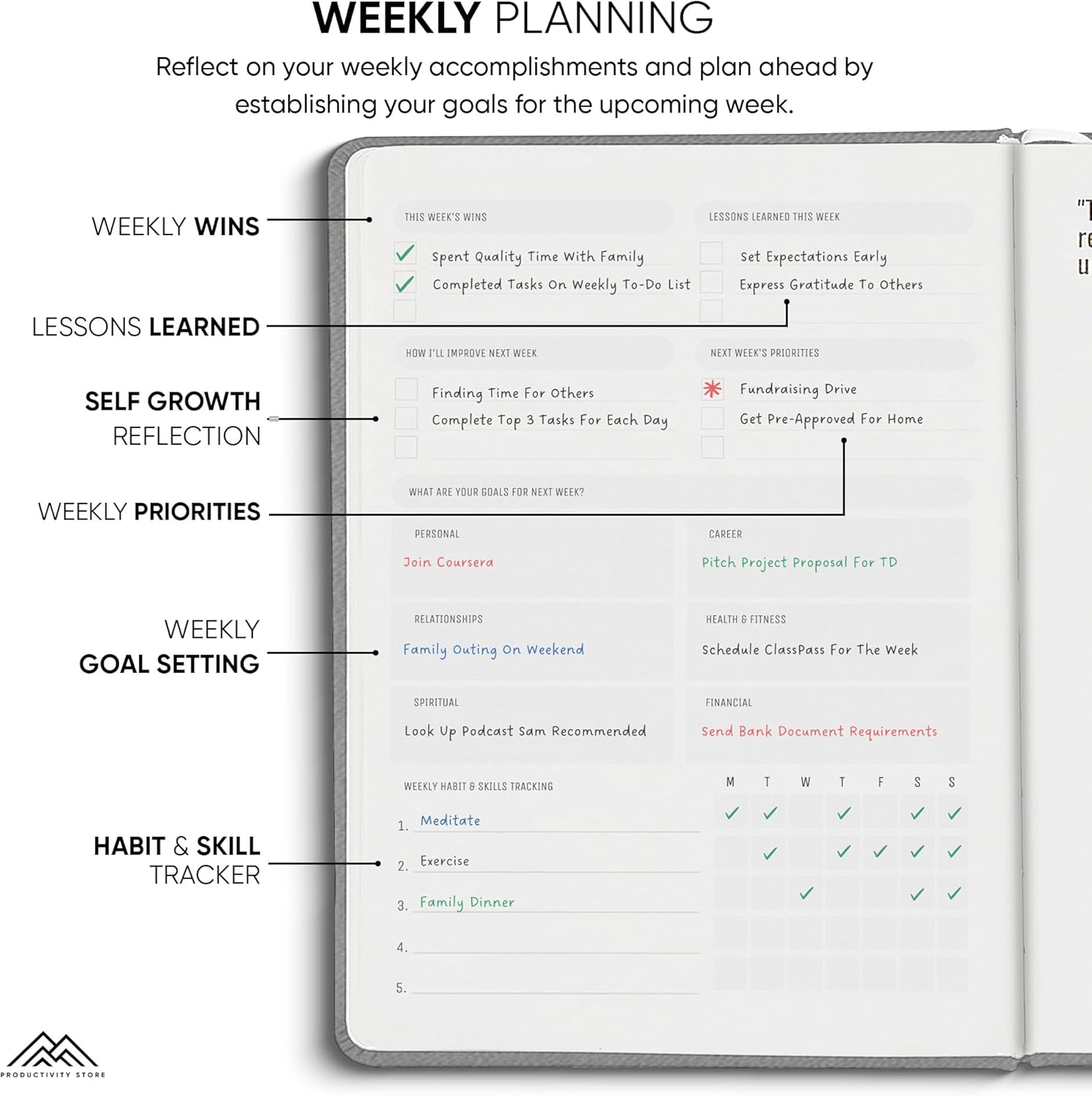 - ✅ WEEKLY PLANNER WITH BONUS FEATURES: Plan ahead each week by establishing your weekly goals and reflect on your performance each week. Comes with 5 Bonus features including a detailed habit tracker, weekly inspirational quotes, a daily productivity score and a budget planner.