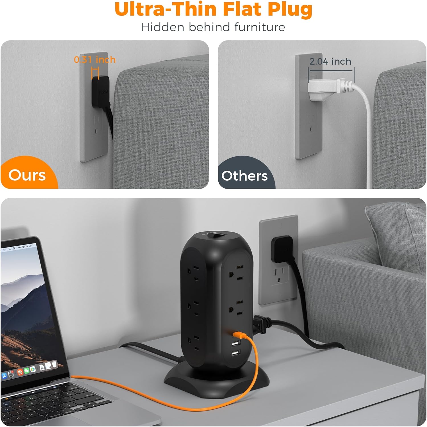 - Flat Plug for Widely Used: The extension cord with multiple outlets also has a 45° flat plug, which features a low profile fits easily in tight spaces, and the 45 degrees angled plug to keep other outlets vacant. Widely used for home, office, or other places