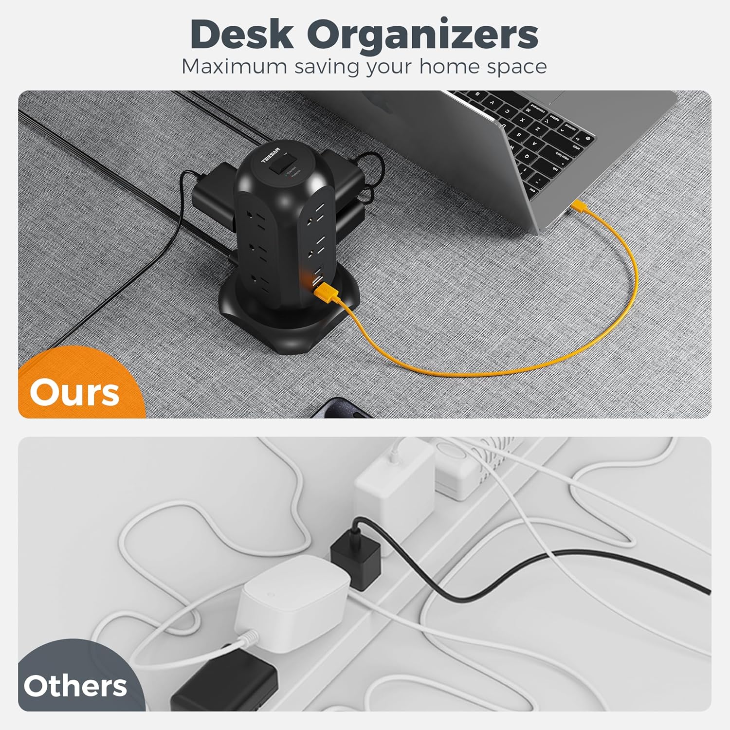 - Space-Saving: Equipped with an assortment of 11 AC sockets and 3 USB ports, this innovative power strip has sockets perpendicularly positioned to the floor, maximizing space compared to the conventional models. The ergonomic spacing and orientation of the sockets will allow better organization of the space as the whole system can be tucked away neatly into tight spaces and corners. Choose this office supplies, and make your desktop tidy.