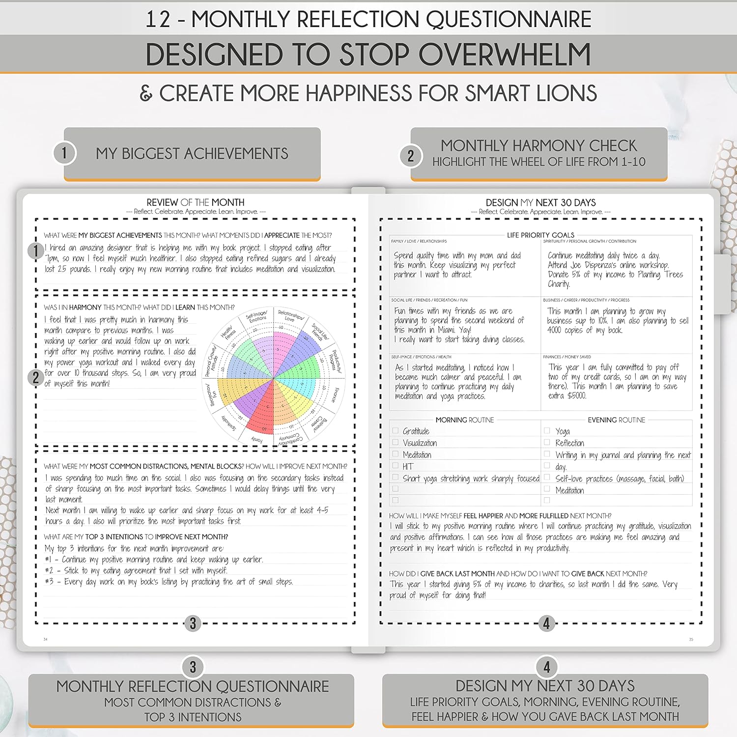- SELF CARE PLANNER - This premium planner is undated and combines daily, weekly, and monthly planning features along with productivity, goal setting, business organization, to-do lists, notebook functionality, and gratitude journaling all in one. It includes goal-setting guidance that teaches you how to apply the law of attraction and vibration principles to become the best possible version of yourself on a mental, physical, and interpersonal level, thereby increasing productivity and happiness.