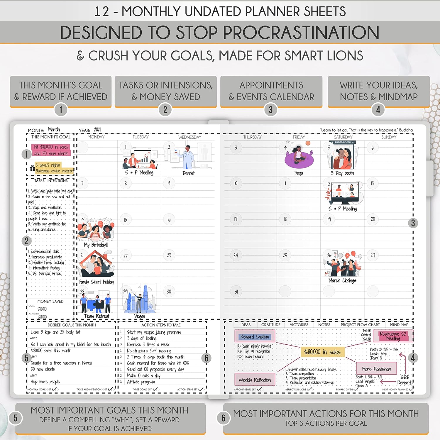 Life Planner - Undated Daily, Weekly & Monthly Planner with Budget Section | A 12 Month Journey to Increase Productivity & Happiness | Life Organizer & Gratitude Journal - Horizontal Format