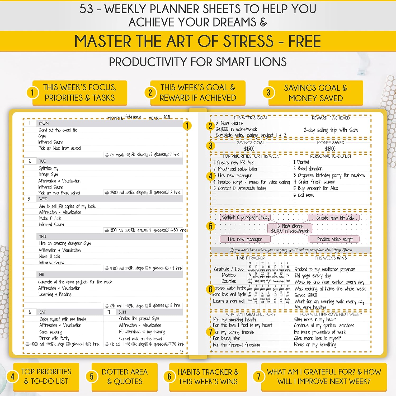 - UNDATED PLANNER - All the tools for success you need to create the life you've always wanted. This planner measures A5 (6 x 8.5 inches) and boasts thick 100 gsm paper. It features a Horizontal Planner layout, offering 212 pages for life transformation, including 53 weekly spreads, 12 monthly planning overviews with reflection sections, 22 dotted journal pages, habit trackers, mind maps, morning and evening routines, inner pockets, pen holder, and comes in a gift box. This life planner is undated, serving as a daily, weekly, and monthly planner, giving you the freedom to start your journey whenever it suits you best.