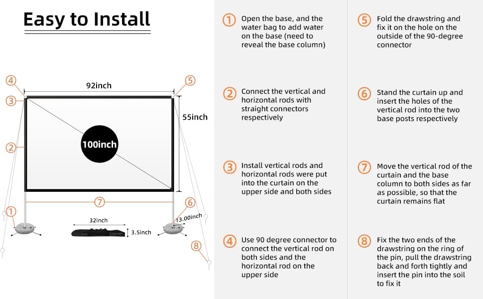 - 🎥【NOTE】Please be careful to use the projection screen in strong wind, heavy rain, heavy snow. The projection screen can be washed or ironed to get a brand new projection screen. Product update and upgrade.