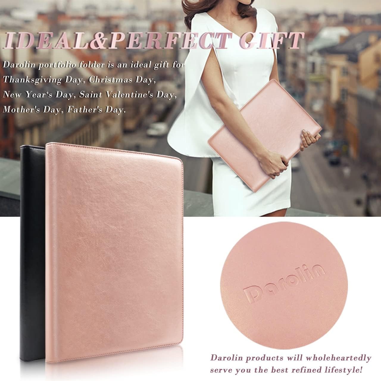 - [PREMIUM MATERIAL & PORTABLE SIZE] 100% Handmade with high quality PU leather material, reinforced stitching, make our portfolio case more durable. Size of Darolin padfolio portfolio case is 12.9*9.6 inch, and it fits for A4/Letter size paper.