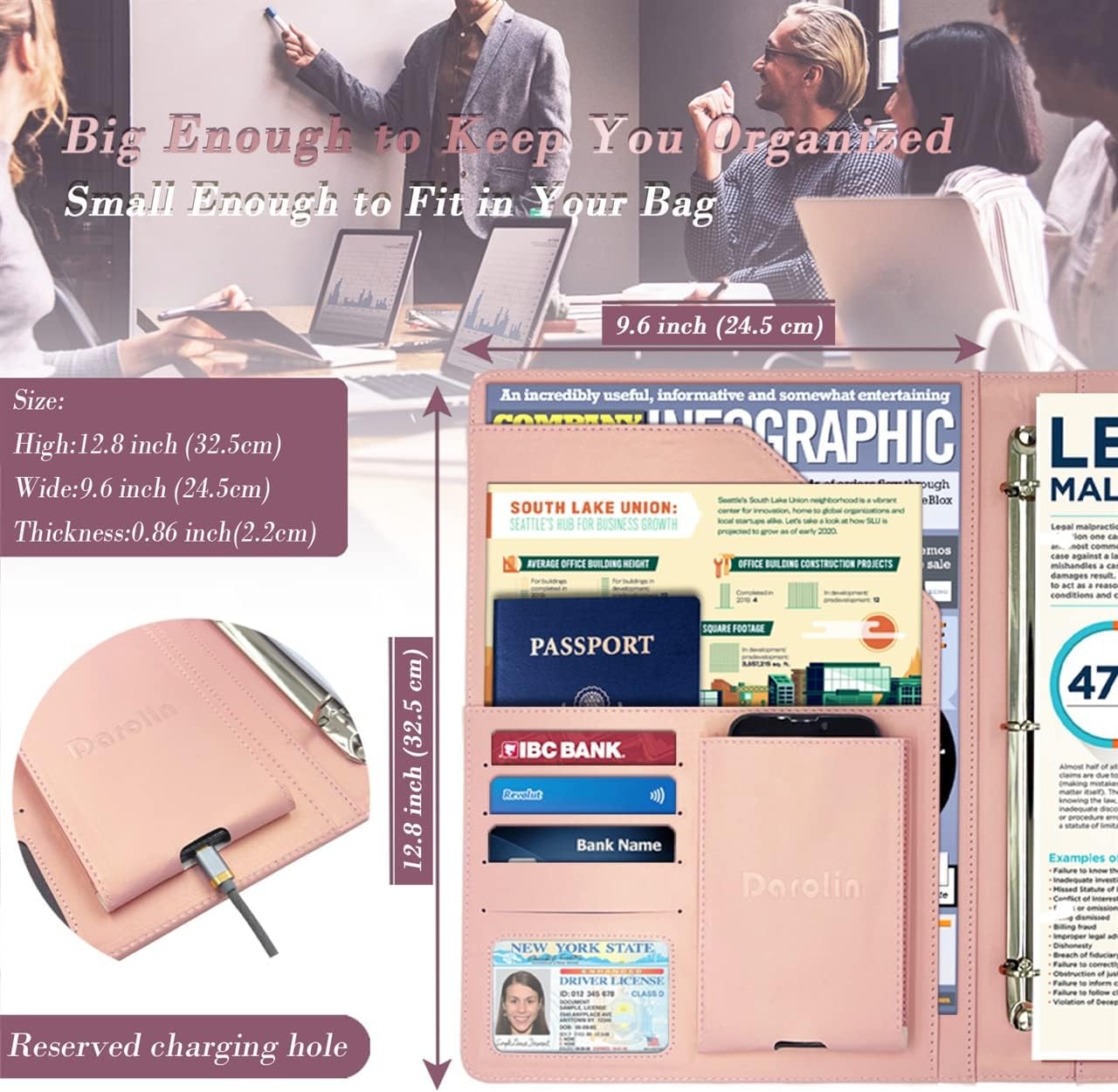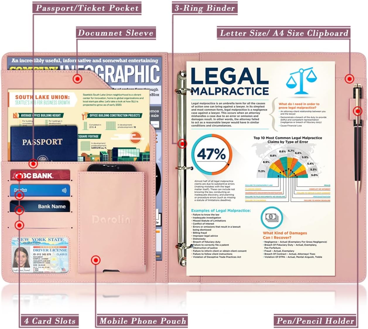 - [PRACTICAL & ORGANIZED] Darolin Portfolio Binder 3 Ring case designed with one Stainless Steel 3 Ring Binder, Pen Loop, Cell Phone Holder, File pocket, Bill Pocket and 4 Card Holders. Various inside pockets and slots capable of holding documents, letters, notes, envelopes, mobile phone, pens, business cards and other stuffs, which facilitate your daily use and business travels, make your work or study more efficient, which brings great convenience in daily life.