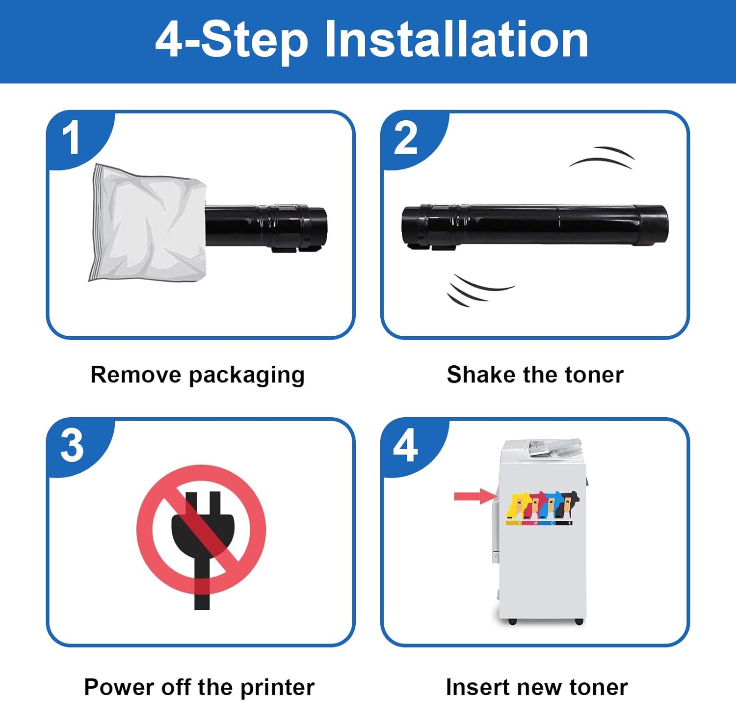 - 【Installation method】Take out the old toner cartridge of the corresponding color, shake the cartridge horizontally 2-3 times to make the toner uniform, and put it into the printer to use
