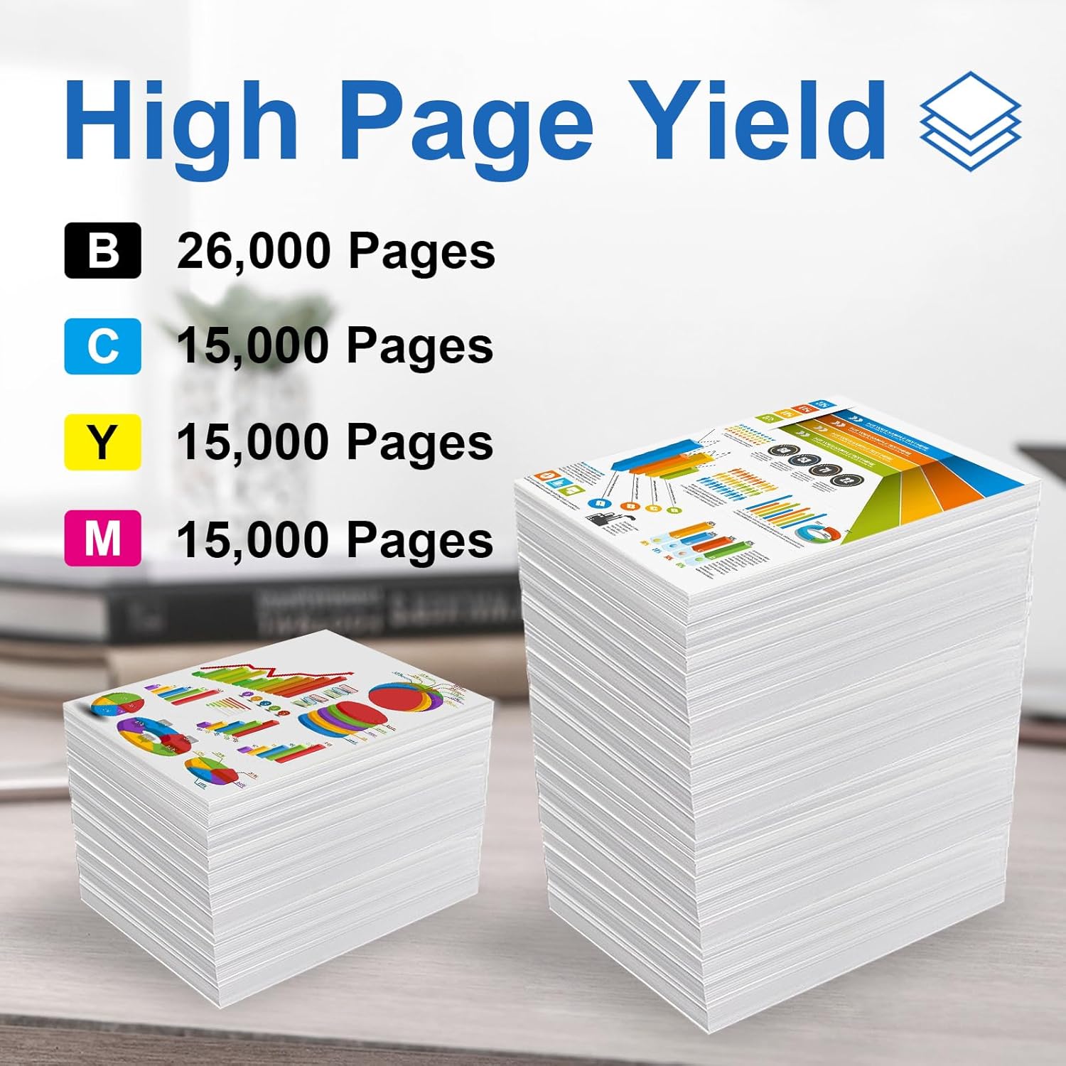 - 【Estimated Page Yield】26,000 pages per Black, 15,000 pages per Cyan Magenta Yellow,, at 5 percent Coverage of A4 letter.
